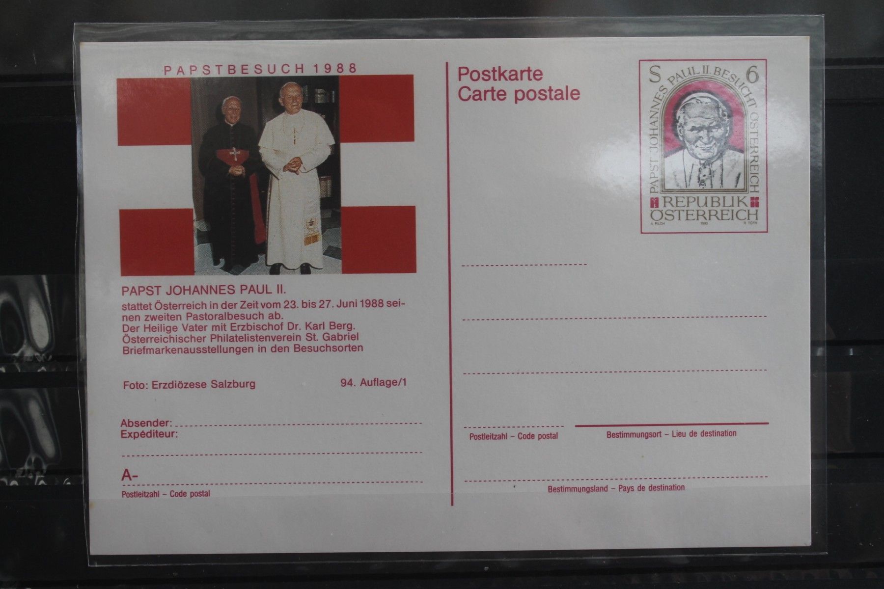Wertstempel Papst Johannes Paul II. Papstbesuch in Österreich 1988. Ganzsache in transparenter PVC- und weichmacherfreier Schutzhülle.