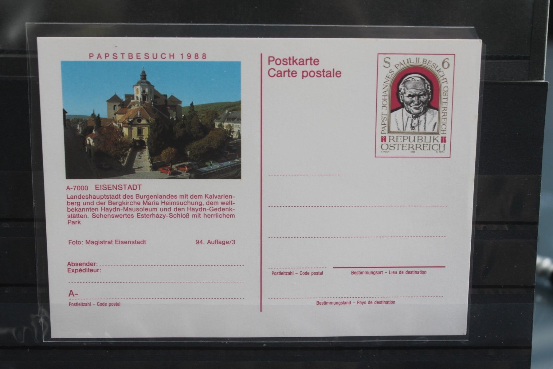 Wertstempel Papst Johannes Paul II. Papstbesuch in Österreich 1988. Ganzsache in transparenter PVC- und weichmacherfreier Schutzhülle. Eisenstadt.