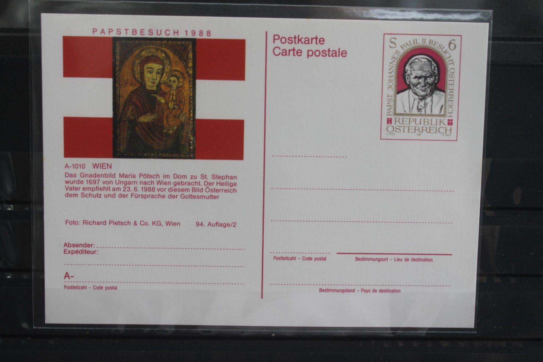 Wertstempel Papst Johannes Paul II. Papstbesuch in Österreich 1988. Ganzsache in transparenter PVC- und weichmacherfreier Schutzhülle.