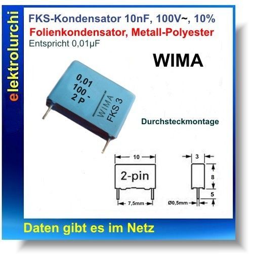 0,01uF, 10nF, 100V-, FKS Folien Kondensator / Metall-Pol. RM7,5mm, Wima, 3St.