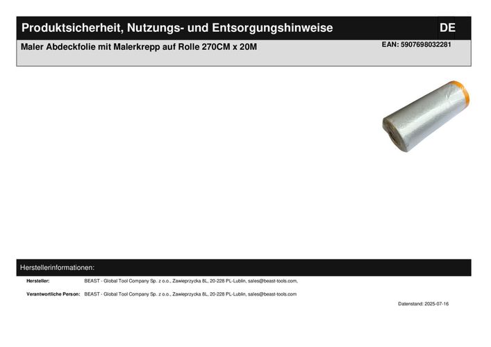 0,13 EUR/qm Malerfolie Abdeckfolie mit Krepp auf Rolle 270CM x 20M zum Abkleben