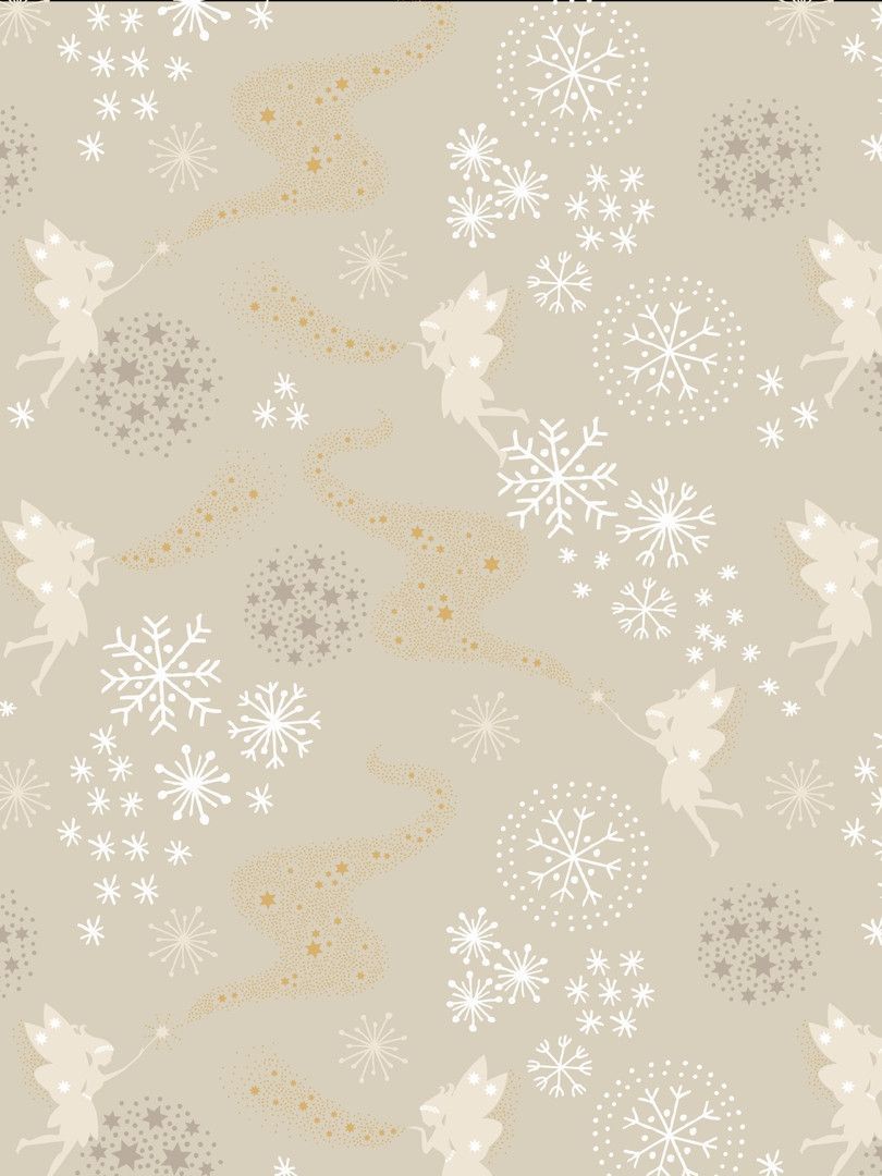 Material: 100% Baumwolle Breite: 112 cm Der Stoff wiegt ca. 150 g qm Grundfarbe: beige mit weißen und creme farbenen Motiven und goldenem Feen-Staub