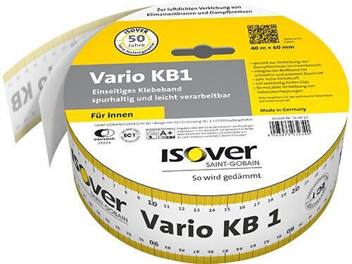 Vario KB 1 Das einseitige Klebeband für Überlappungen im Innenraum ! Das extra spurhaltige Klebeband Vario KB 1 besitzt eine extrem hohe Klebekraft. Es wurde speziell zur luftdichten Verklebung der Überlappungen der patentierten Vario Klimamembranen ISOVER Vario KM KM Duplex UV im Innenraum entwicke