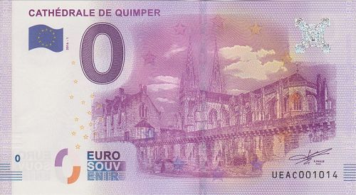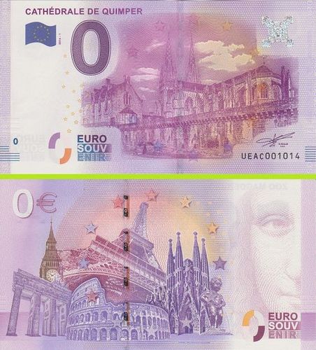 0 Euro Souvenirschein Frankreich Cathedrale de Quimper Land: Frankreich Jahr: 2016 ( 2016-1 ) Material: Original Euro Banknoten Papier - Oberthur Technologies (Chantepie, Frankreich) Maße: 135 x 74 mm Gewicht: 0,90 g Qualität: Druckfrisch Auflage: 10.000 Unikat dank individueller Seriennummer! (Numm