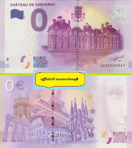 0 Euro Souvenirschein Frankreich Château de Cheverny Land: Frankreich Jahr: 2017 ( 2017-2 ) Material: Original Euro Banknoten Papier - Oberthur Technologies (Chantepie, Frankreich) Maße: 135 x 74 mm Gewicht: 0,90 g Qualität: Druckfrisch Auflage: 10.000 --- OFFIZIELL AUSVERKAUFT Unikat dank ind