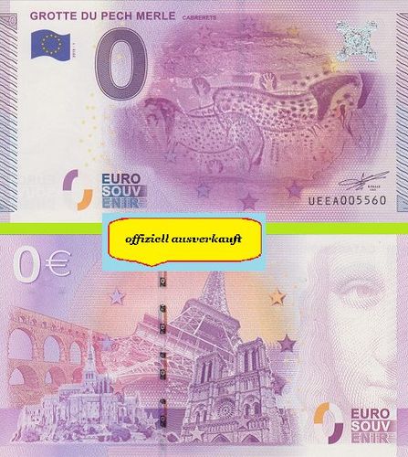 0 Euro Souvenirschein Frankreich Grotte du Pech Merle Land: Frankreich Jahr: 2015 ( 2015-1 ) Material: Original Euro Banknoten Papier - Oberthur Technologies (Chantepie, Frankreich) Maße: 135 x 74 mm Gewicht: 0,90 g Qualität: Druckfrisch Auflage: 10.000 --- OFFIZIELL AUSVERKAUFT Unikat dank individu