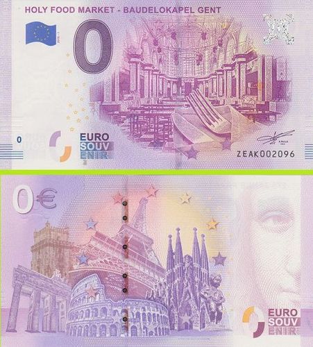 0 Euro Souvenirschein Belgien Holy Food Market - Baudelokapel Gent Land: Belgien Jahr: 2018 ( 2018-1 ) Material: Original Euro Banknoten Papier - Oberthur Technologies (Chantepie, Frankreich) Maße: 135 x 74 mm Gewicht: 0,90 g Qualität: Druckfrisch Auflage: 5.000 Unikat dank individueller Seriennumme