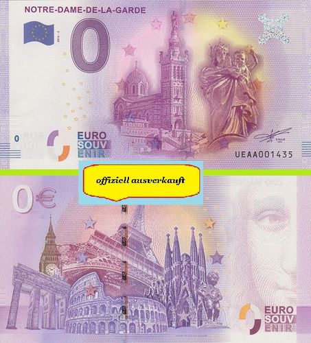 0 Euro Souvenirschein Frankreich Notre-Dame-de-la-Garde Land: Frankreich Jahr: 2016 ( 2016-3 ) Material: Original Euro Banknoten Papier - Oberthur Technologies (Chantepie, Frankreich) Maße: 135 x 74 mm Gewicht: 0,90 g Qualität: Druckfrisch Auflage: 10.000 --- OFFIZIELL AUSVERKAUFT Unikat dank indivi