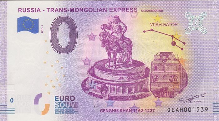 0 Euro Souvenirschein Russland Russia - Trans-Mongolian Express Ulaanbaatar Land: Russland Jahr: 2019 ( 2019-4 ) Material: Original Euro Banknoten Papier - Oberthur Technologies (Chantepie, Frankreich) Maße: 135 x 74 mm Gewicht: 0,90 g Qualität: Druckfrisch Auflage: 5.000 Unikat dank individueller S