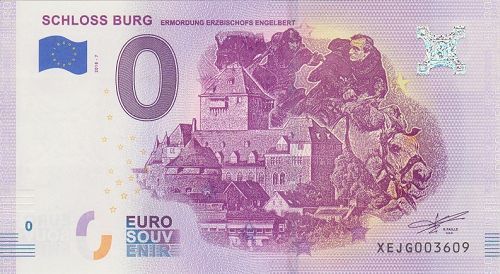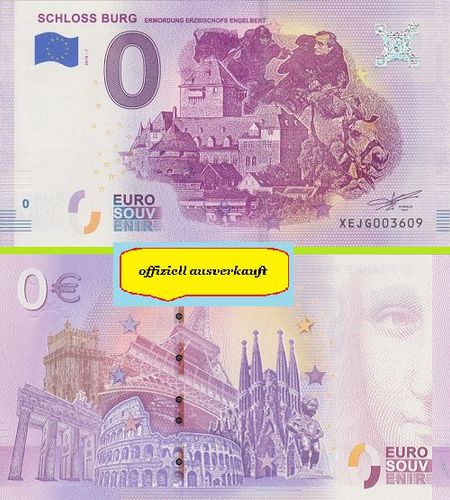 0 Euro Souvenirschein Deutschland Schloss Burg Ermordung Erzbischofs Engelbert Land: Deutschland Jahr: 2018 ( 2018-7 ) Material: Original Euro Banknoten Papier - Oberthur Technologies (Chantepie, Frankreich) Maße: 135 x 74 mm Gewicht: 0,90 g Qualität: Druckfrisch Auflage: 5.000 --- OFFIZIELL AUSVERK