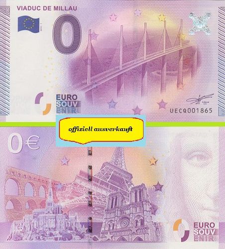 0 Euro Souvenirschein Frankreich Viaduc de Millau Land: Frankreich Jahr: 2015 ( 2015-1 ) Material: Original Euro Banknoten Papier - Oberthur Technologies (Chantepie, Frankreich) Maße: 135 x 74 mm Gewicht: 0,90 g Qualität: Druckfrisch Auflage: 10.000 --- OFFIZIELL AUSVERKAUFT Unikat dank individuelle