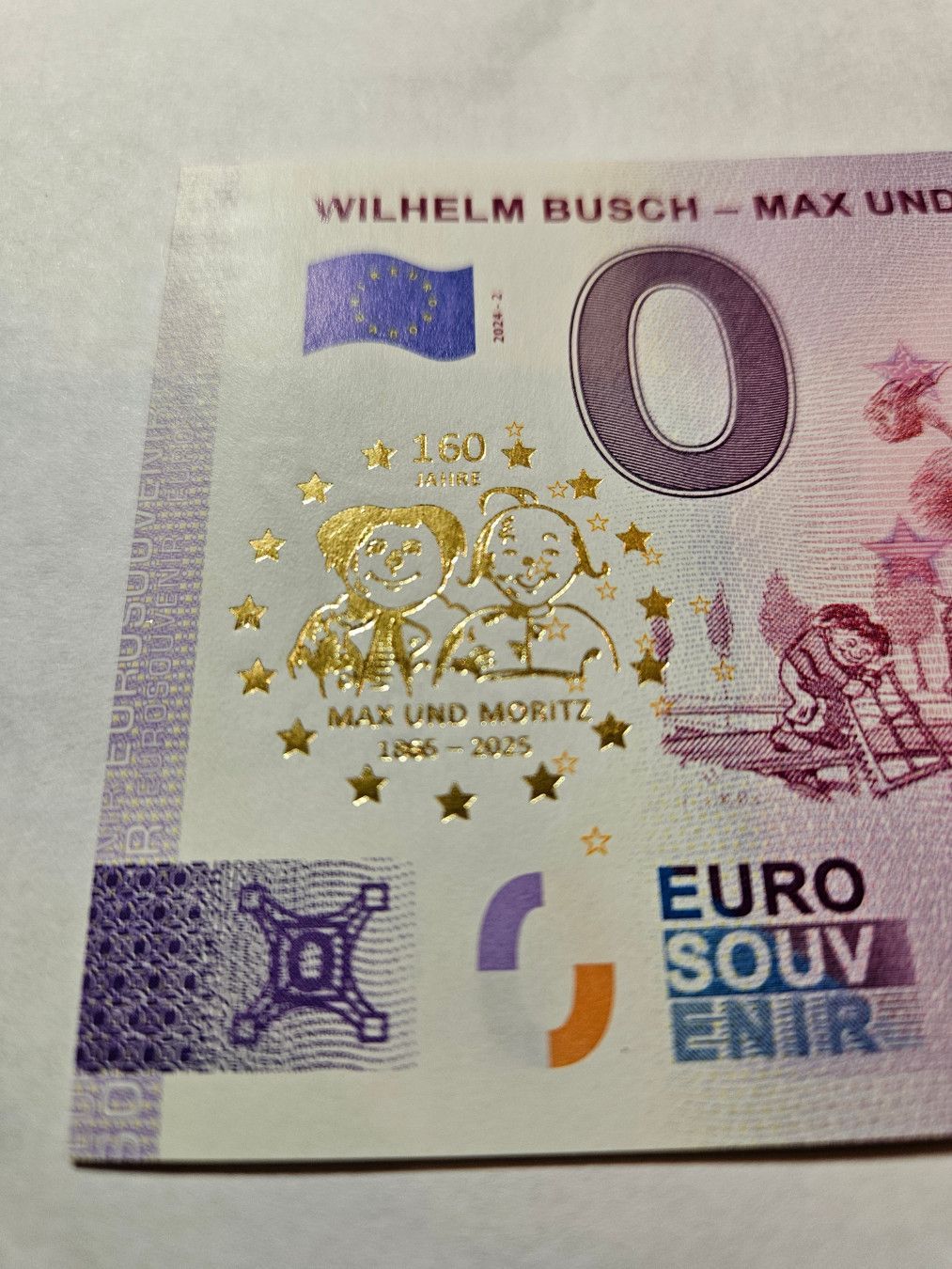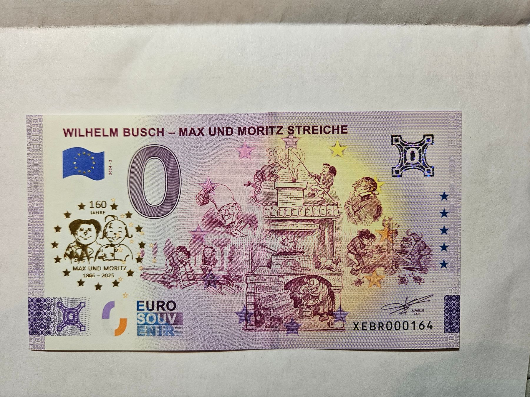 XEBR 2024-2 Der 0 Euro Schein mit dem Motiv der berühmten Streiche von Max und Moritz, gezeichnet von Wilhelm Busch, ist ein begehrtes Sammlerstück für Liebhaber von Papiergeld und Münzen. Die detailreiche Gestaltung und die hochwertige Druckqualität machen diesen Schein zu einem einzigartigen Samme