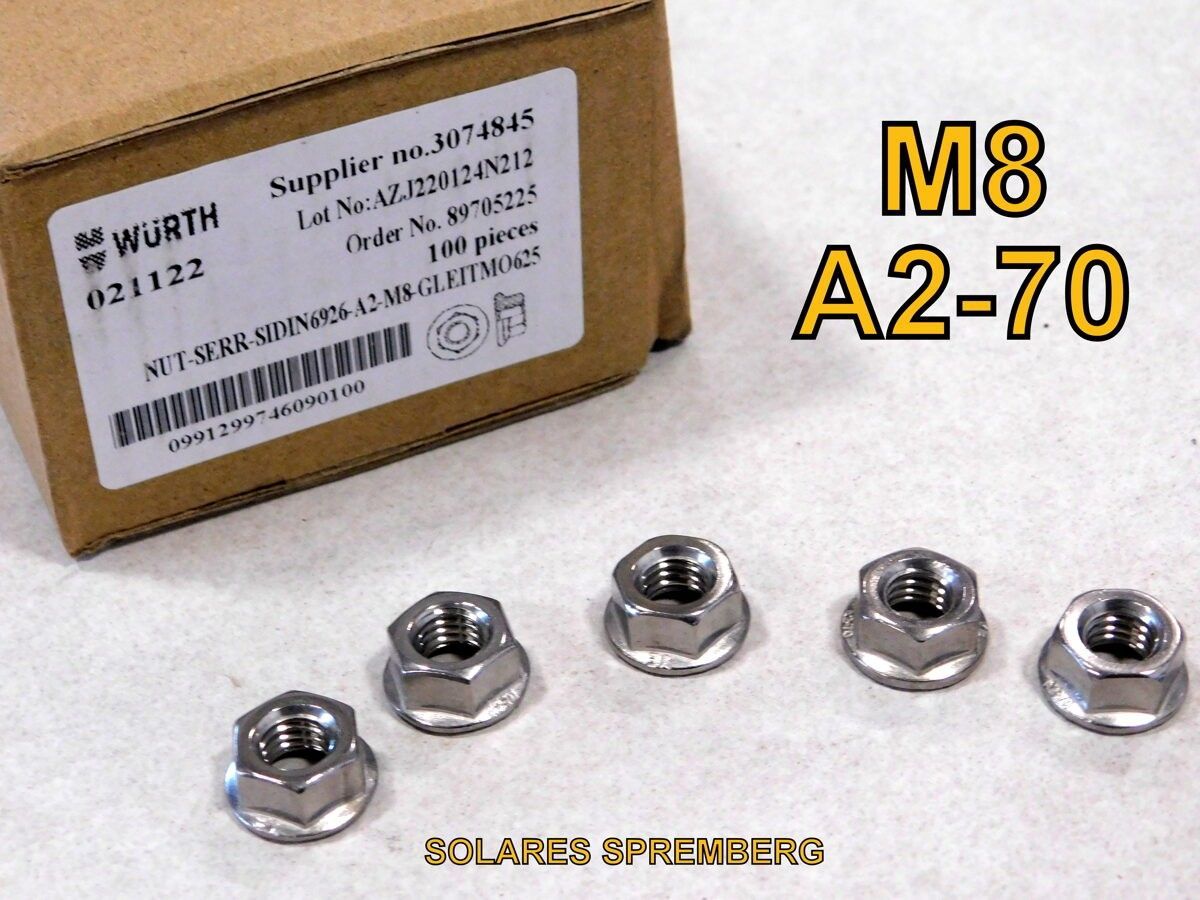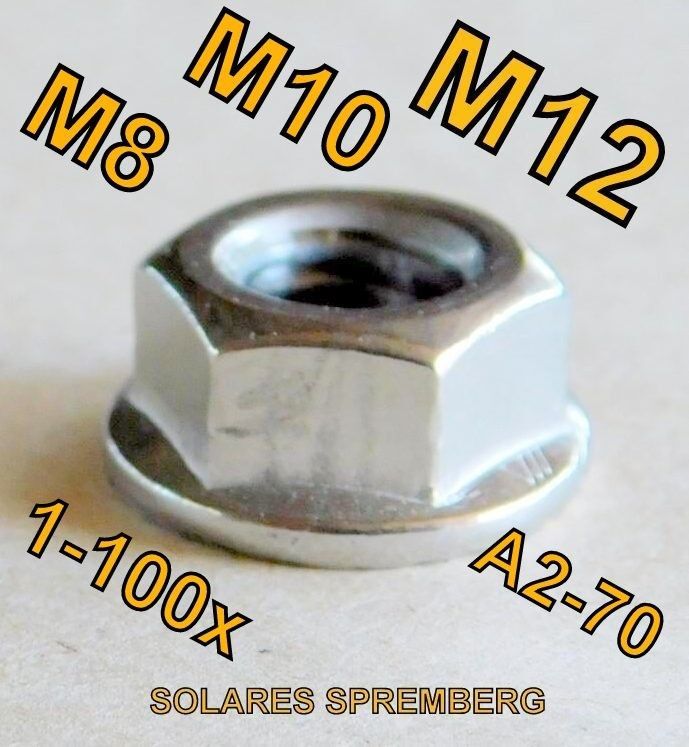 1-100x M8 M10 M12 Sechskantmuttern mit Flansch und Sperrverzahnung Edelstahl A2-70 DIN 6923 ETA zum Einsatz in der Photovoltaik Gewindeart: metrisch Schlüsselweite: 13mm Gewindeart: metrisch Schlüsselweite: 15mm Gewindeart: metrisch Schlüsselweite: 18mm ----------------------------------------------