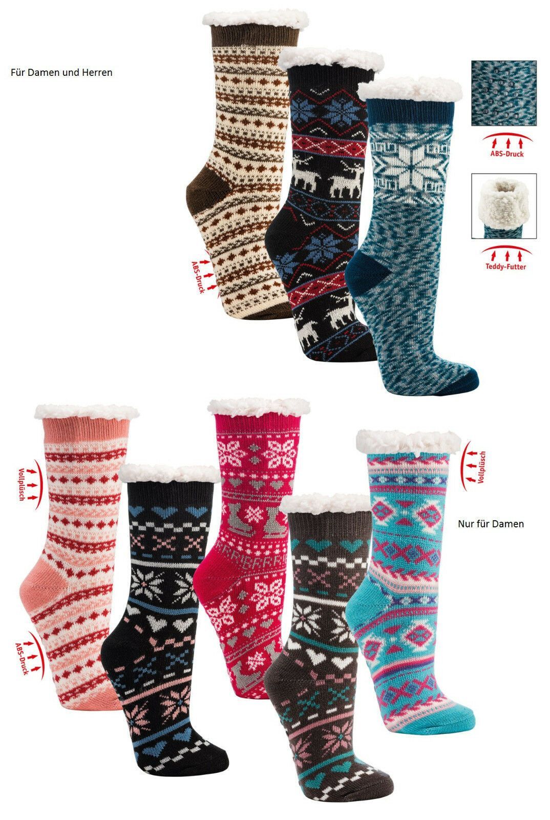 1-2 Paar ABS Hüttensocken Hausschuhe Socken Teddy Innenfutter warm weich Herren