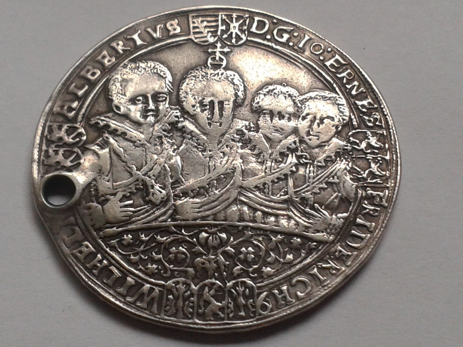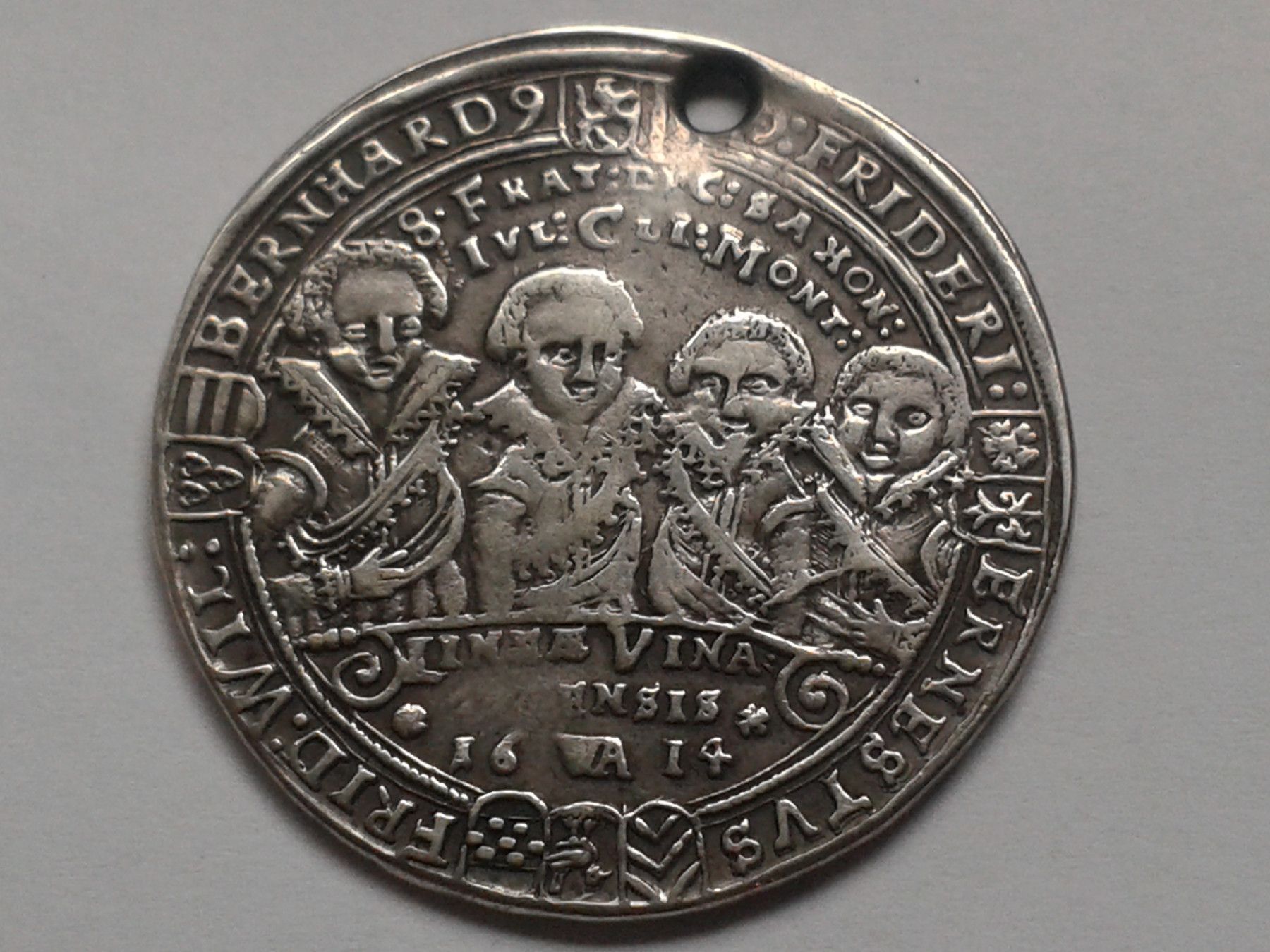 1 2 Reichstaler 1614 Sachsen Mittelere Linie Weimar 8-Brüdertaler Johann Ernst und seine 7 Brüder, Silber schöne Patina, gelocht. Lit. Koppe 199 bei Fragen: