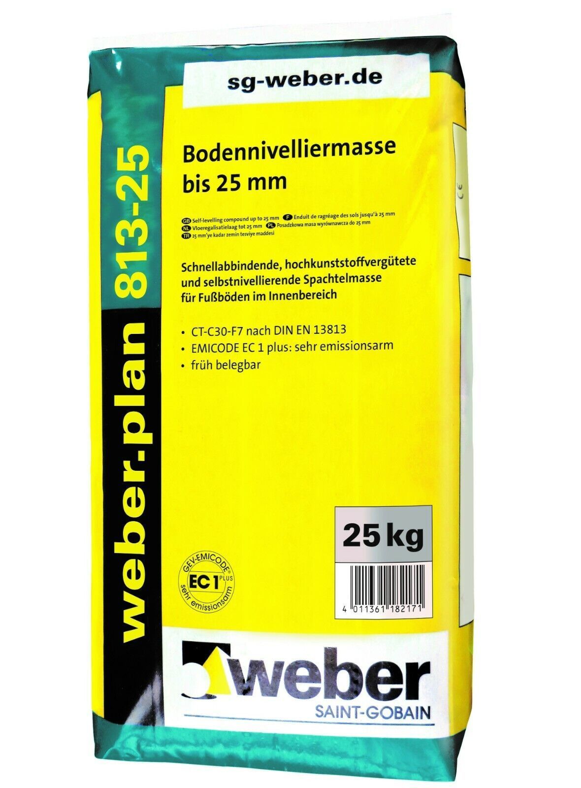 Weber Bodennivelliermasse weber.plan 813-25 Schnellabbindende, selbstnivellierende Spachtelmasse für Fußböden im Innenbereich. Anwendungsgebiet : weber.plan 813-25 ist eine leicht verlaufende, schnellabbindende Nivelliermasse zum Ausgleichen formstabiler Untergründe wie: Zement-, und Calciumsulfates