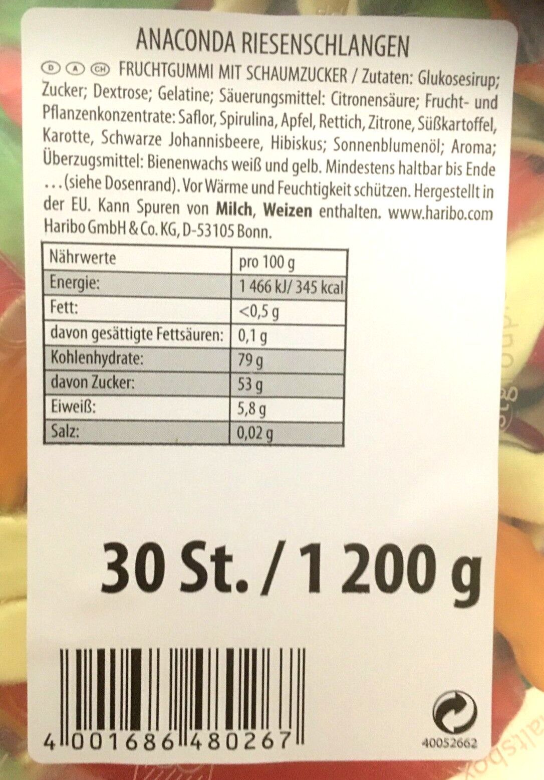 HARIBO 1 Dose | Haribo Anaconda Riesenschlangen | je 30 Stück a 40 gr | 1,2kg pro Dose