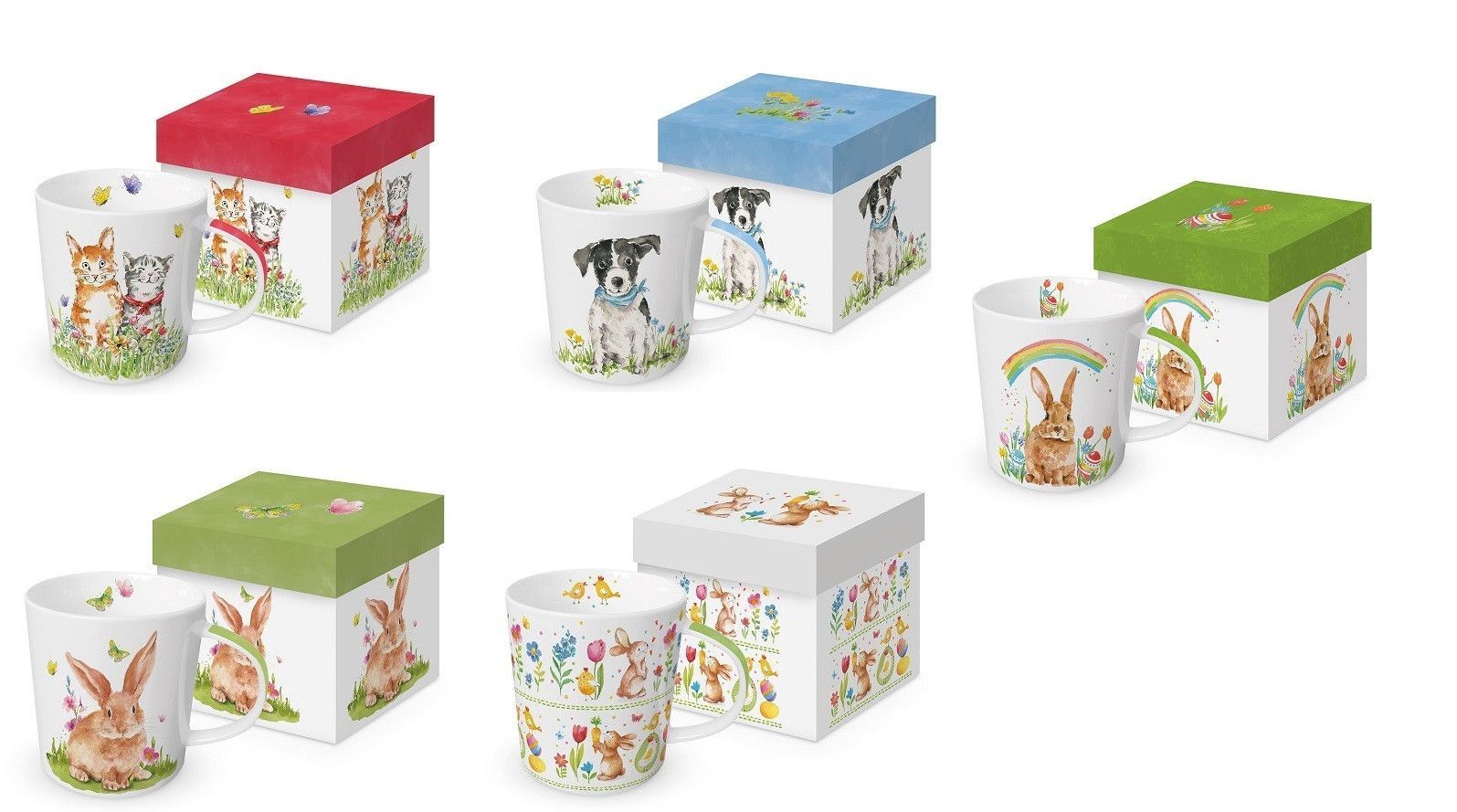 1 Kaffeebecher, Katze, Hund o. Hase Geschenkbox, Henkelbecher Bauernhoftier Tasse
