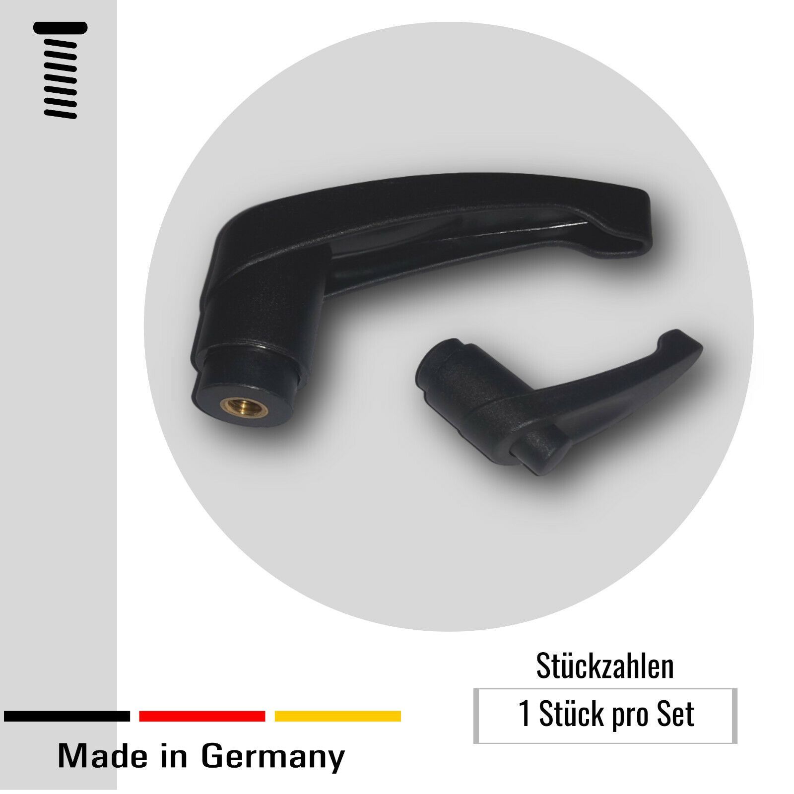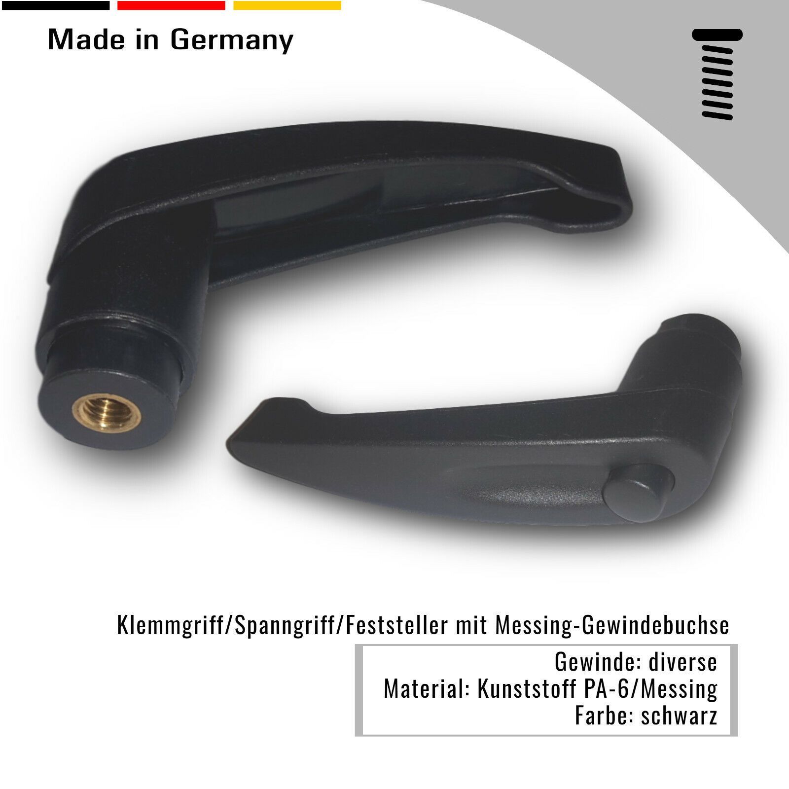 1 Klemmgriff mit Gewindebuchse u. Feststeller, Kunstoff Messing, Schwarz Die angegebene Länge ist die Grifflänge Mit dem integrierte Druckknopf können Sie den Griff lösen und feststellen Material: Kunstoff PA-6 Messing Entdecken Sie auch unsere anderen Angebote Filzgleiter, Möbelfüße, Unterlegscheib