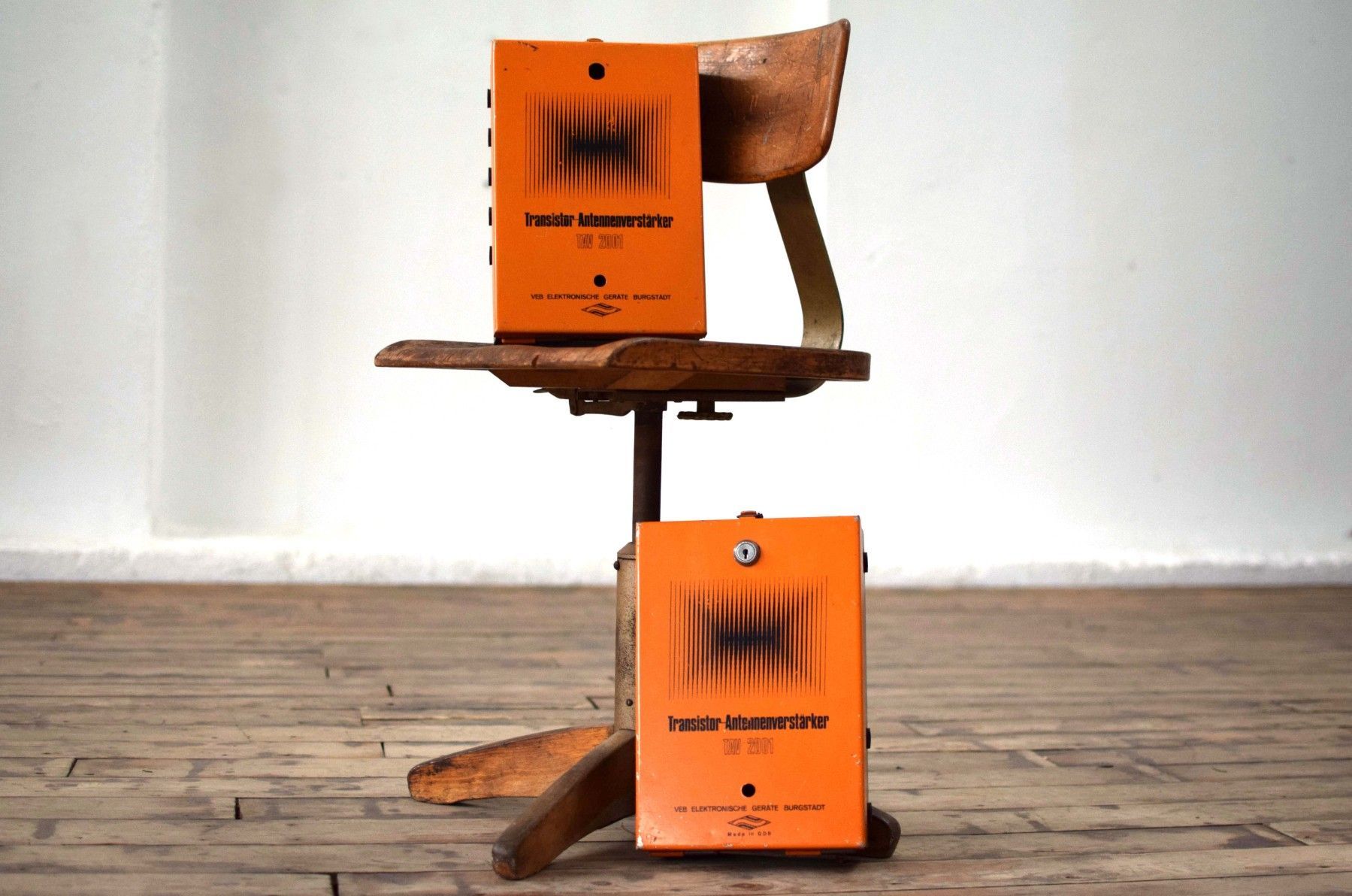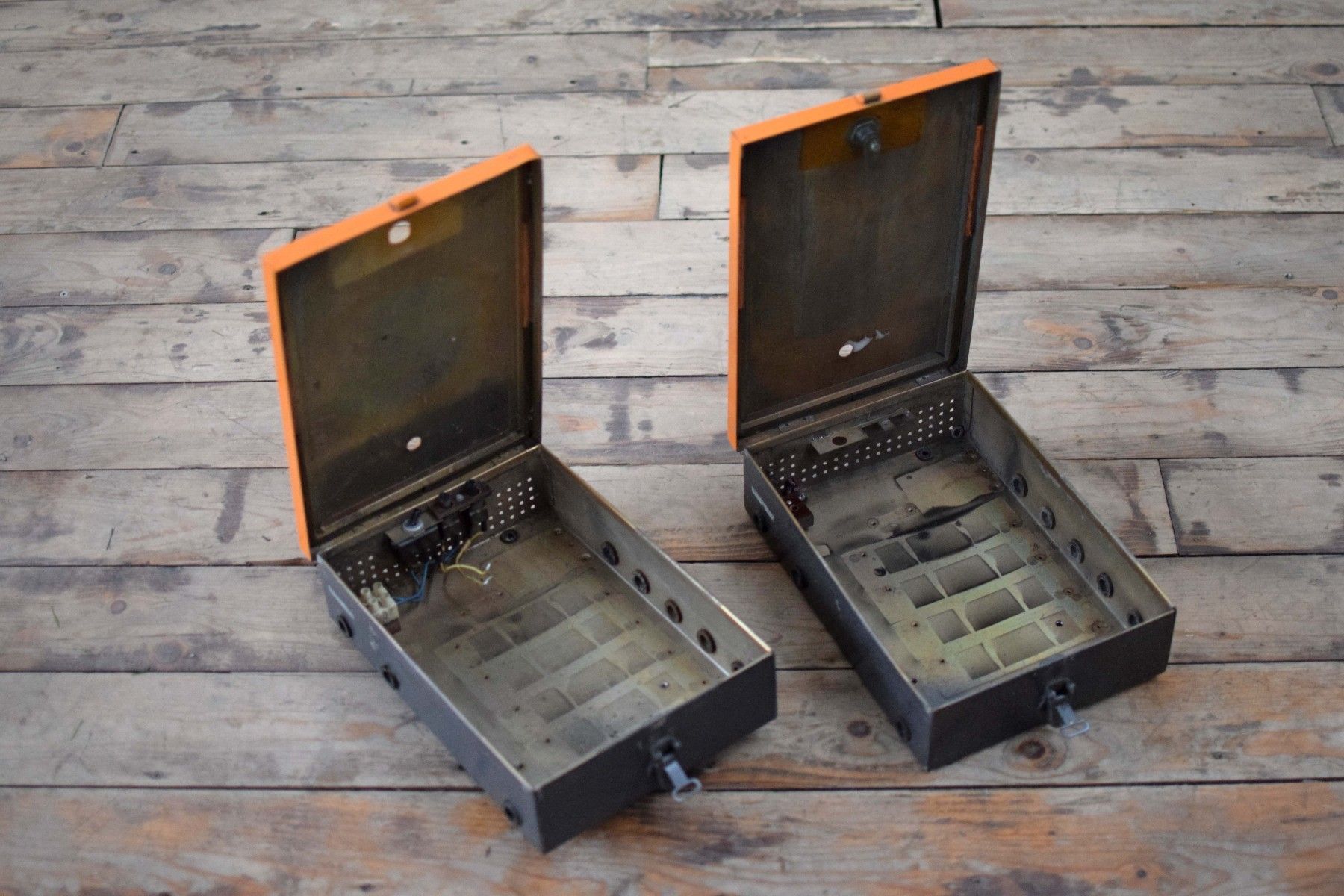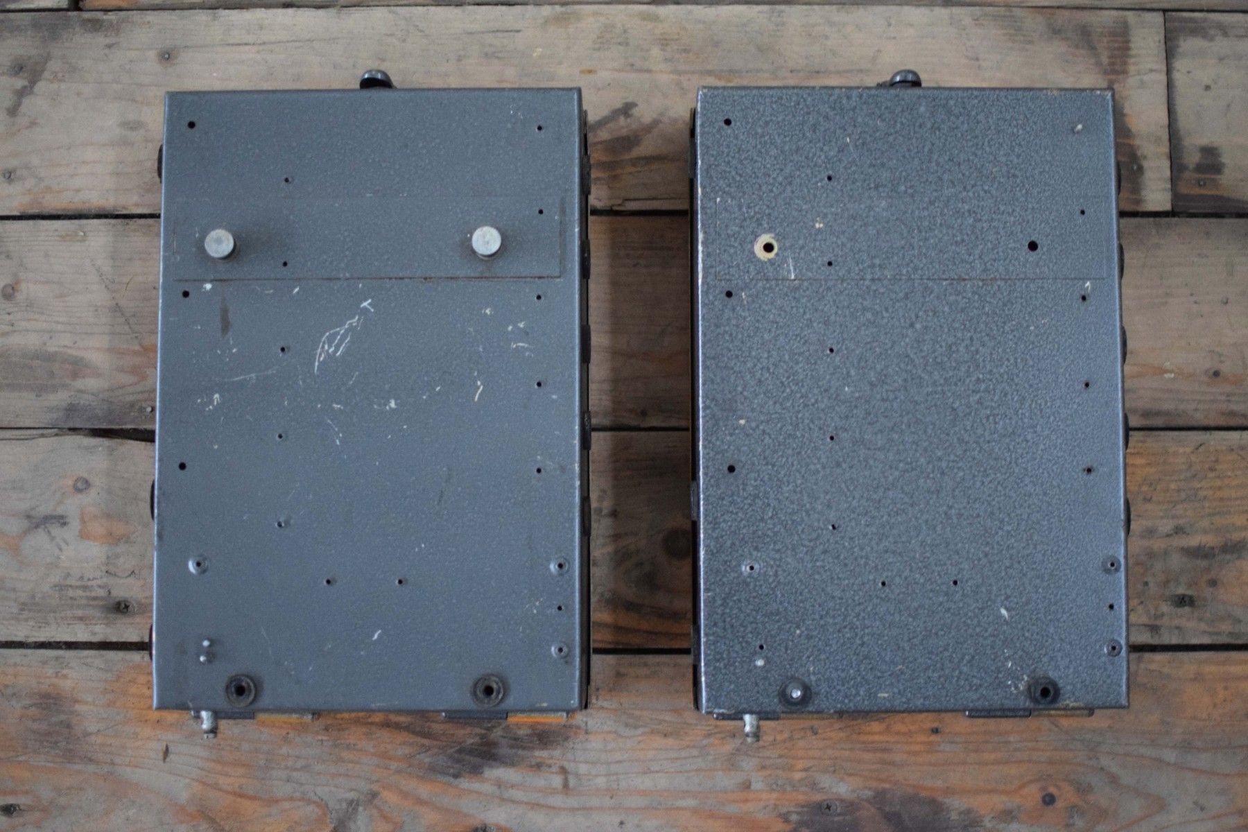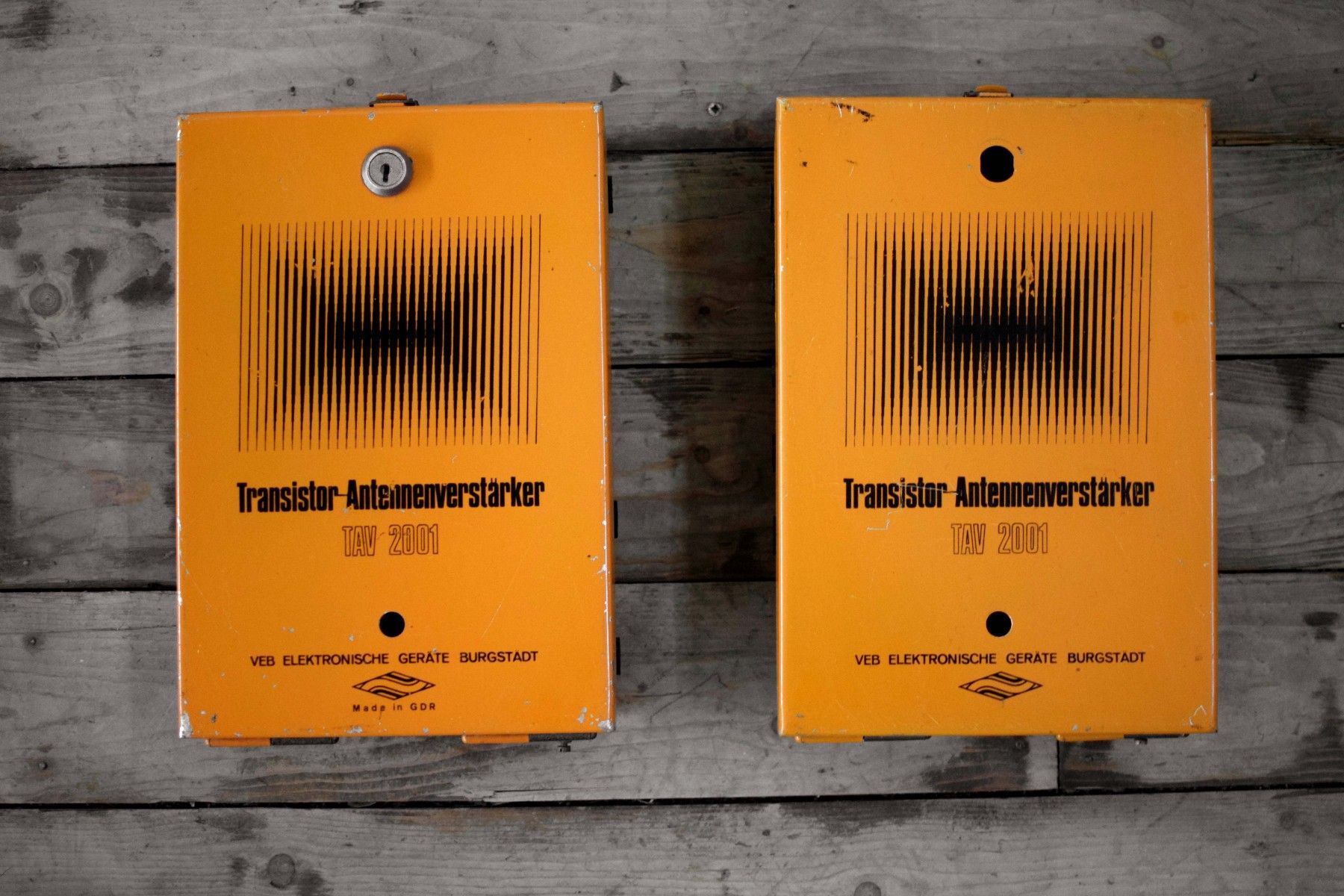 ein Paar alter Metallkästen gemarkt mit: "Transistor Antennenverstärker TAV 2001" VEB Elektronische Geräte Burgstädt Höhe 8cm, Breite 22cm Tiefe 31cm mit Deckel, die Kästen sind leer mit Gebrauchsspuren wie abgebildet. Verkaufsgegenstand sind die beiden Kästen als Paar zum Preis von 22,50€ Der Versand innerhalb Deutschlands ist kostenlos und erfolgt per DHL Paket.