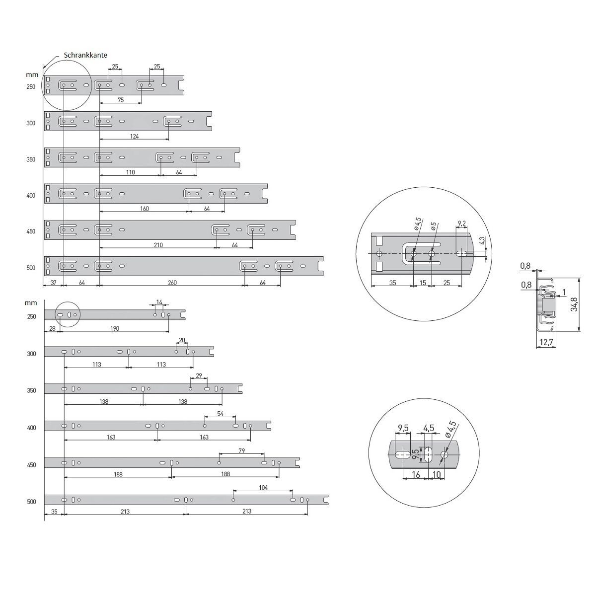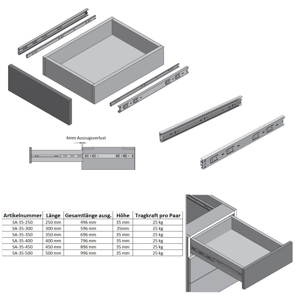 1 Paar Schubladenauszüge Vollauszug Korpusschienen verzinkt Kugelführung Kugelauszug
