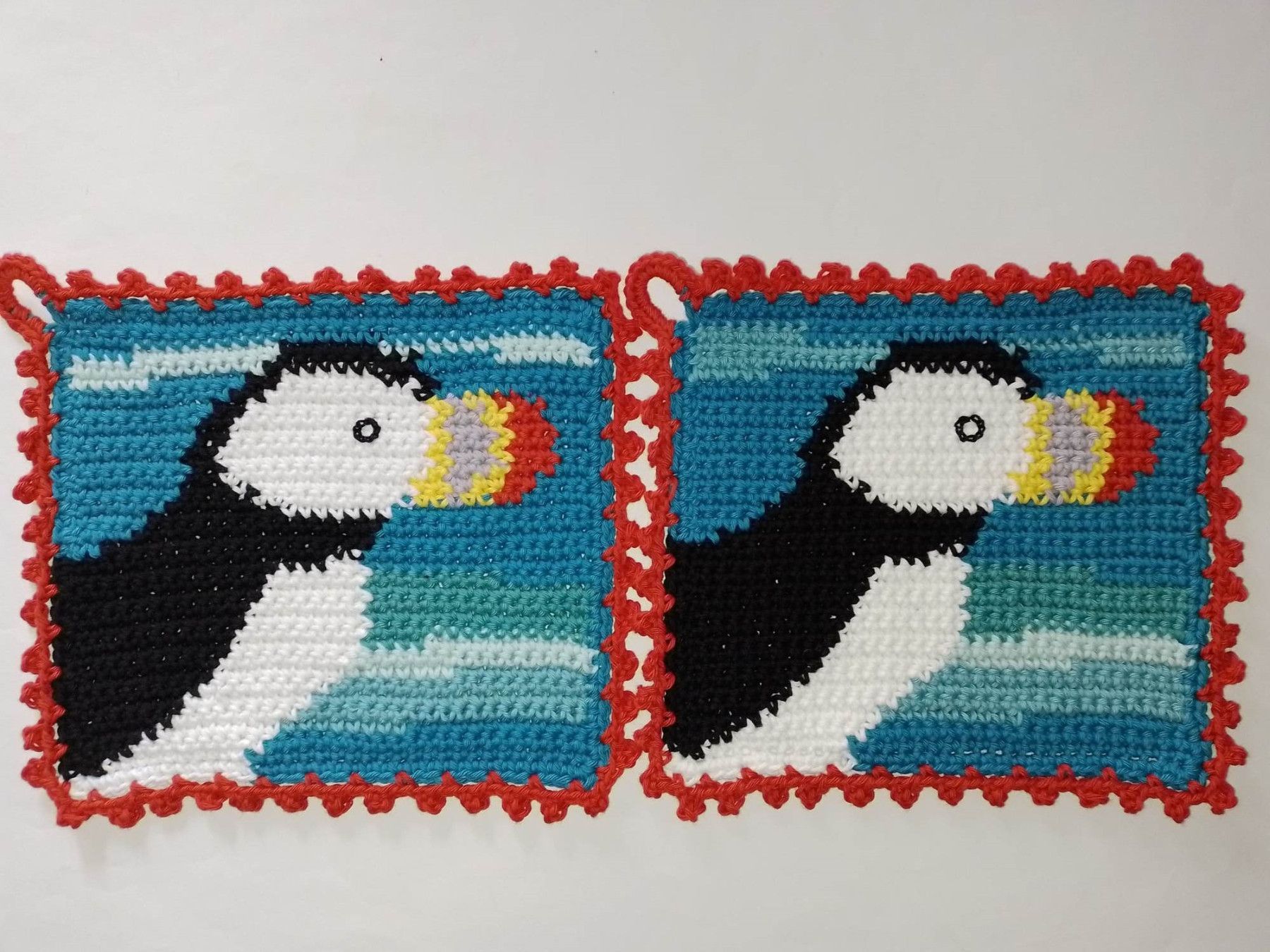 1 Paar Topflappen Papageientaucher Handarbeit gehäkelt Baumwolle Tier Vogel