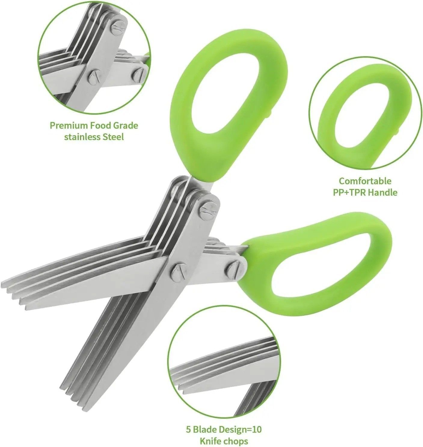 This multifunctional stainless steel kitchen scissors is designed with 3 or 5 sharp layered blades, perfect for quickly shredding scallions, herbs, peppers, and other vegetables. The durable stainless steel construction ensures long-lasting sharpness and rust resistance, while the ergonomic handle p