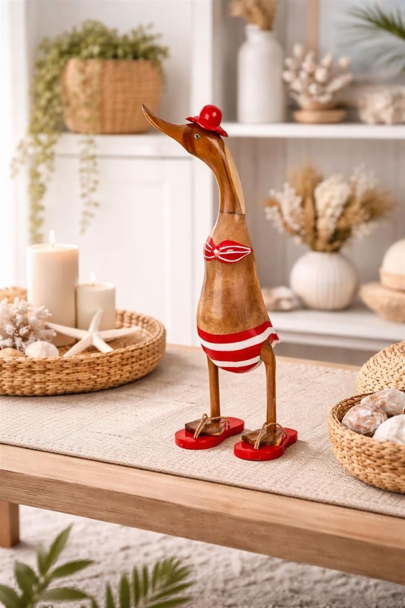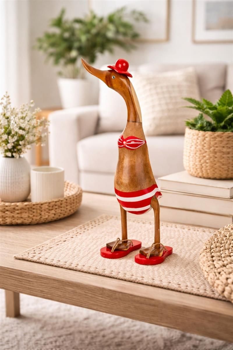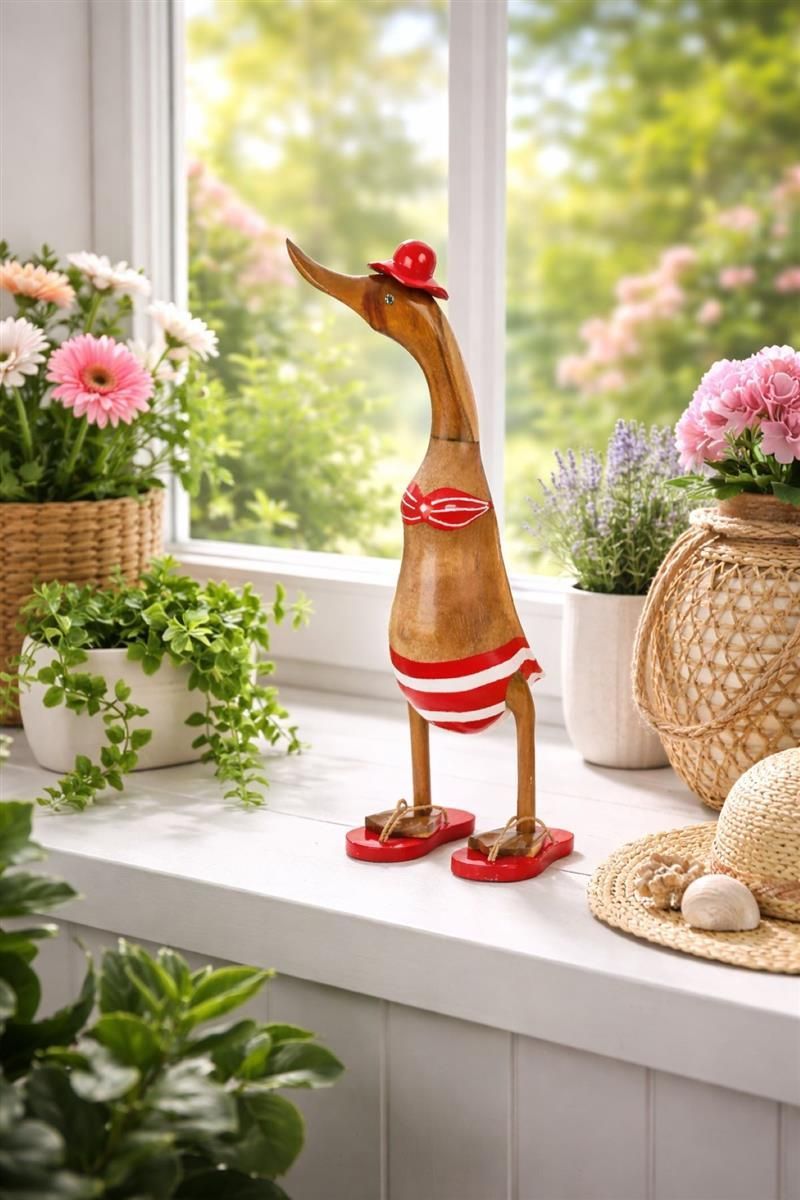 Bali Ente Bikini Rot Diese wunderschöne Entenfigur ist mehr als nur eine Dekoration – sie ist ein echtes Statement-Stück mit Charakter. Mit ihrem verspielten roten Bikini und den passenden Flip-Flops versprüht sie pure Sommerlaune und sorgt sofort für einen stilvollen Blickfang in Ihrem Zuhaus