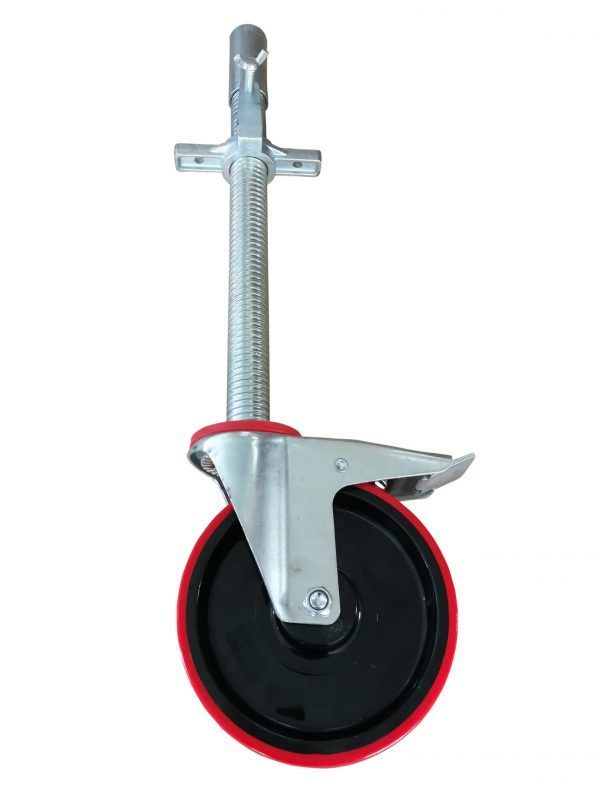 AC Gerüstrolle 200 mm mit Stahlspindel für Rohr-Innendurchmesser 43-47 mm, max. Belastung: 275 kg Stück, doppelt gebremst (horizontal & vertikal), Belag: Hartgummi mit Nylonkern, Stahl-Führungshülse zur Zentrierung der Rolle im Rohr, mit Flügelmutter am Knebel zur Befestigung am Gerüstrohr, für