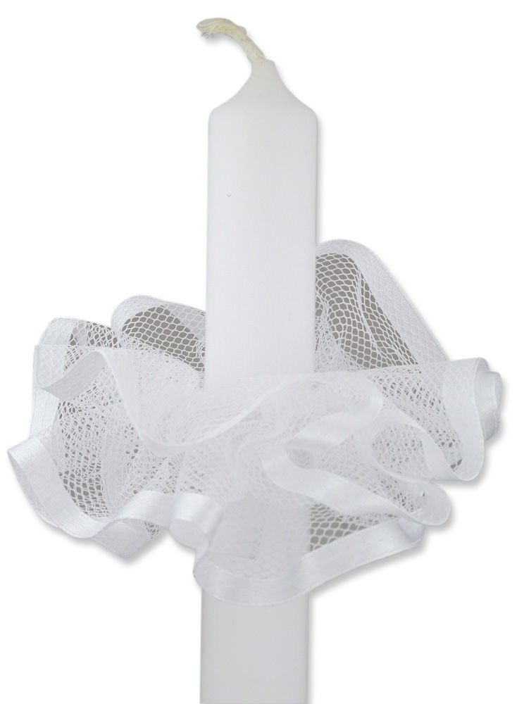 1 Stück Tropfenfänger - Tüll, mit Satinband, für Tauf-. Kommunionkerzen etc. Material: Tüll Farbe: weiss Größe 120mm x 90mm Für Kerzen bis Durchmesser 40mm geeignet