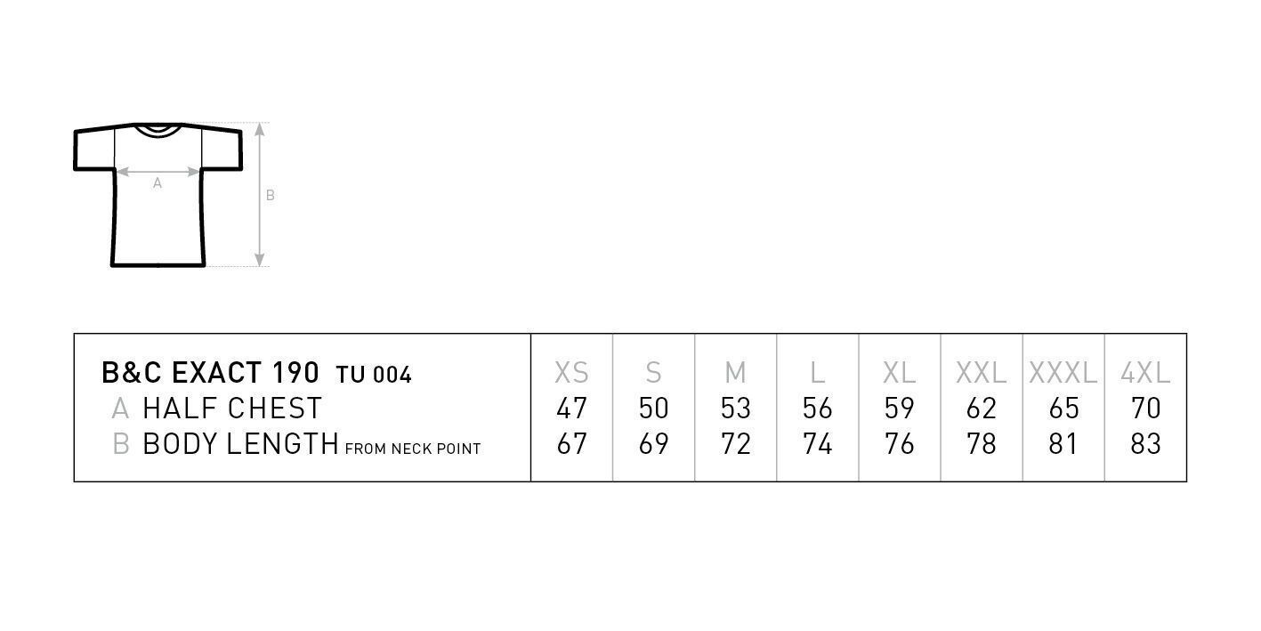 Sie kaufen hier ein bedrucktes T-Shirt mit dem oben abgebildeten Motiv. Textilinformationen: T-Shirt B&C - Rundstrickware - Nackenband - Exact-Rundhalsausschnitt, doppelt gelegt - Kragen in 1x1 Ripp-Strick mit Elasthan - Bund unten und Ärmelbund mit doppelter Steppnaht - 185 g m² Single Jersey - 100