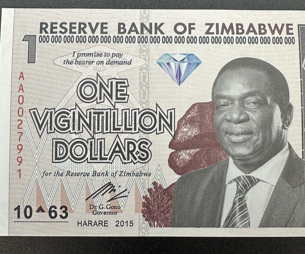 Diese Auflistung ist für eine extra feine 1 Vigintillion Dollars Simbabwe 2015 Diese Simbabwe Note war ein Teil der Serie Inflationswährung. Die Scheine haben unterschiedliche Seriennummern und gelten nur als Fantasy Banknoten weil sie zu keiner Zeit im Handel waren!!! Mehr als ein Jahrzehnt nach ih