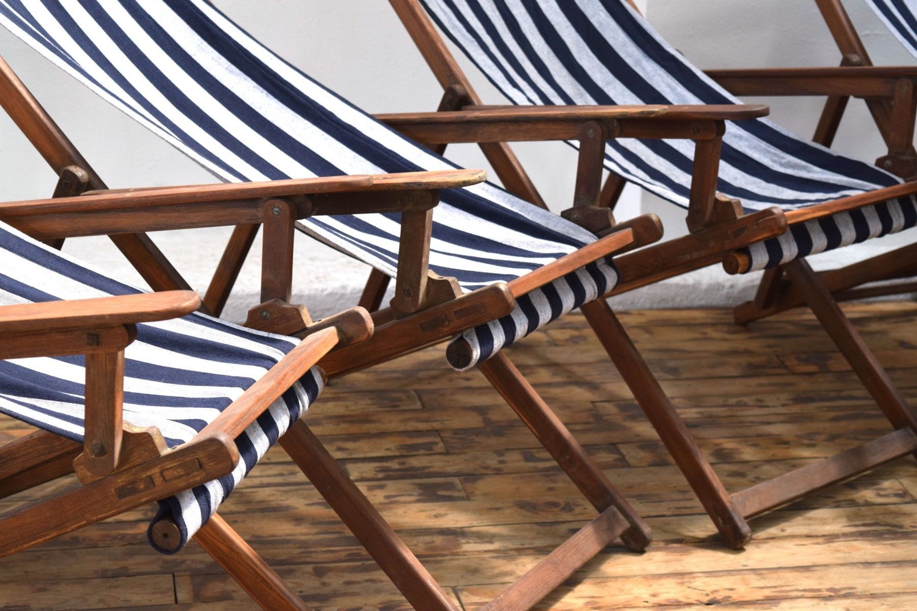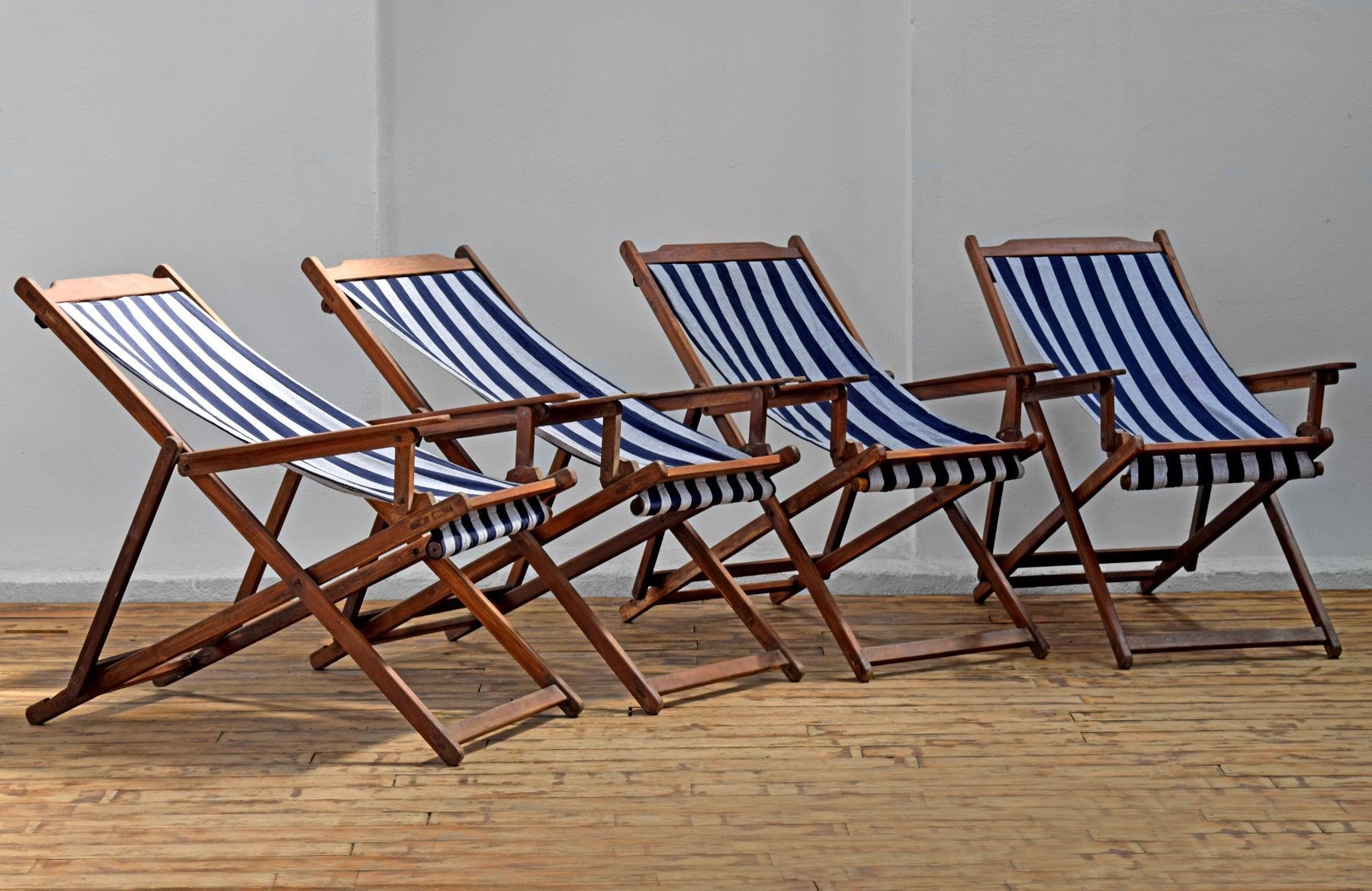 1 von 4 Stück: historischer Sonnenliegestuhl (um 1920) Gestelle aus massivem Teakholz Liegefläche aus dickem Segeltuch, blau/weiß gestreift gepflegte Möbel, stabil, belastbar, schöner Vintage Zustand Höhe 80 bis 100cm, Tiefe 115 bis 130cm, Breite 65cm Maße zusammengeklappt: 11x155x65cm Verkaufsgegenstand ist 1 von 4 Stühlen zum Preis von 238,50€