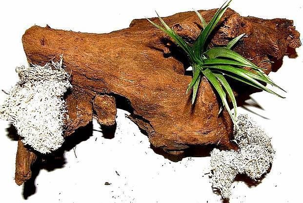 1 Wurzel bepflanzt mit einer Tillandsie und weissem Dekomoos, Terrarium