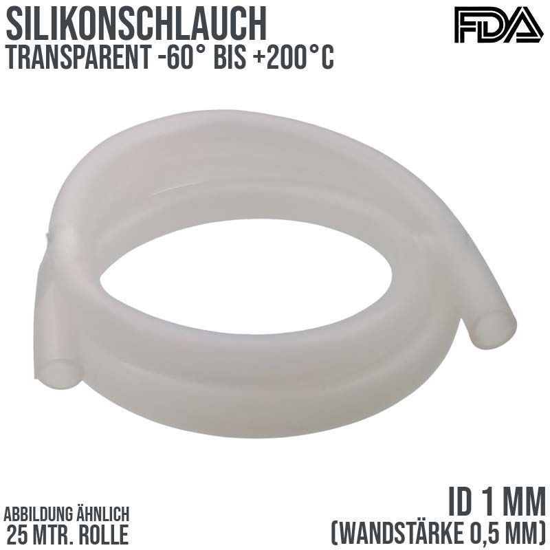 Transparenter, talkumierter und lebensmittelechter (FDA) Silikon / Silicon Schlauch mit einem Innendurchmesser von 1 mm und einem Außendurchmesser von 2 mm.