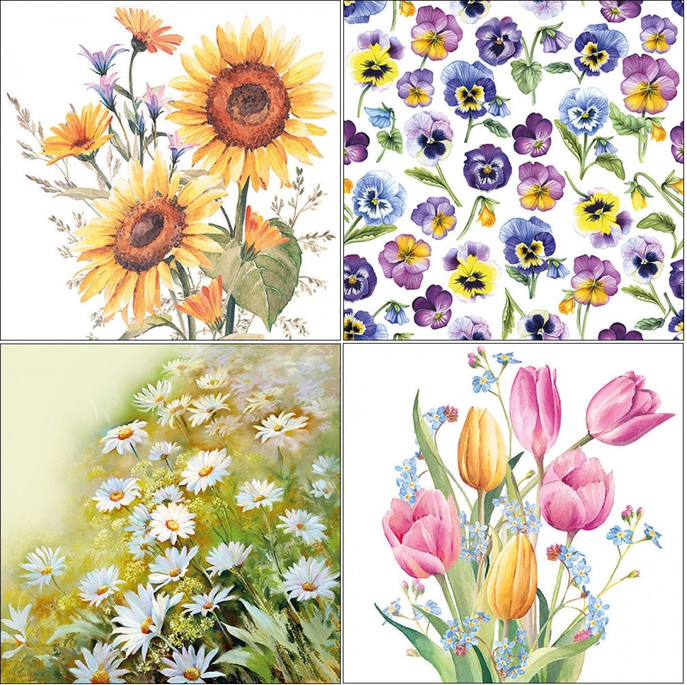 1 x 20 Servietten Blumen 33 x 33 cm, Veilchen Tulpen Sonnenblumen Papierservietten