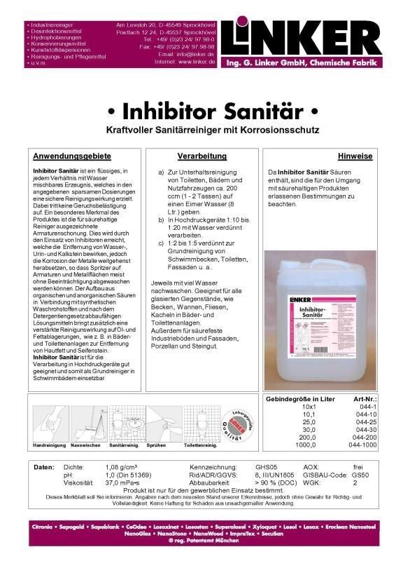 Einstufung des Stoffs oder GemischsKorrosiv gegenüber Metallen: Met. korr. 1 Ätz-/Reizwirkung auf die Haut: Hautreiz. 2 Schwere Augenschädigung/Augenreizung: Augenschäd. 1 GefahrenhinweiseH290 Kann gegenüber Metallen korrosiv sein. H315 Verursacht Hautreizungen. H318 Verursacht schwere Augenschäden. KennzeichnungselementeSignalwort: Gefahr Piktogramme: GHS05: Verursacht schwere Hautverätzungen und Augenschäden Gefahrbestimmende Komponenten: Isotridecylalkohol-Ethoxylaten Phosphorsäure 75 % SicherheitshinweiseP234 Nur im Originalbehälter aufbewahren. P280 Schutzhandschuhe Schutzkleidung Augenschutz Gesichtsschutz tragen. P302+P352 BEI BERÜHRUNG MIT DER HAUT: Mit viel Wasser waschen. P332+P313 Bei Hautreizung: Ärztlichen Rat einholen ärztliche Hilfe hinzuziehen. P362+P364 Kontaminierte Kleidung ausziehen und vor erneutem Tragen waschen. P305+P351+P338 BEI KONTAKT MIT DEN AUGEN: Einige Minuten lang behutsam mit Wasser spülen. Eventuell Kontaktlinsen entfernen. Weiter spülen. P310 Sofort GIFTINFORMATIONSZENTRUM Arzt anrufen. P390 Verschüttete Mengen aufnehmen um Materialschäden zu vermeiden. P501 Inhalt Behälter zuführen. Erste-Hilfe-MaßnahmenNach Einatmen: Frischluft sorgen bei allergischen Erscheinungen Arzt hinzuziehen. Nach Hautkontakt: Mit Polyethylenglykol dann viel Wasser abwaschen Kleidung ausziehen bei Reizung Arzt hinzuziehen. Nach Augenkontakt: 10 bis 15 Minuten spülen Augenarzt aufsuchen. Allgemeine HinweiseBei Verdacht auf Vergiftung ärztliche Begutachtung. Biozidprodukte vorsichtig verwenden. Vor Gebrauch stets Etikett und Produktinformationen lesen. Hersteller und verantwortliche PersonIng. G. Linker GmbH Am Leveloh 20 45549 Sprockhövel Deutschland Tel. +49(0)2324 97 98 21 E-Mail: [email protected]