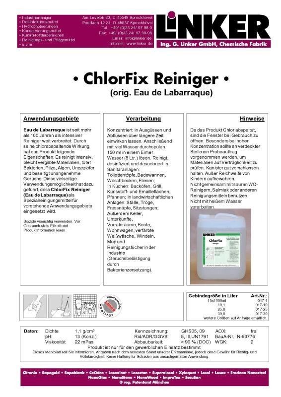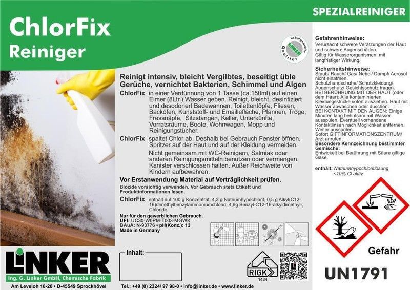 Hersteller und verantwortliche PersonIng. G. Linker GmbH Am Leveloh 20 45549 Sprockhövel Gefahrenkategorien GHS05: Verursacht schwere Hautverätzungen und Augenschäden GHS09: Sehr giftig für Wasserorganismen GefahrenhinweiseH290 Kann gegenüber Metallen korrosiv sein H314 Verursacht schwere Verätzungen der Haut und schwere Augenschäden H400 Sehr giftig für Wasserorganismen H410 Sehr giftig für Wasserorganismen mit langfristiger Wirkung SicherheitshinweiseP260 Staub Rauch Gas Nebel Dampf Aerosol nicht einatmen P273 Freisetzung in die Umwelt vermeiden P280 Schutzhandschuhe Schutzkleidung Augenschutz Gesichtsschutz Gehörschutz tragen P301 P330 P331 BEI VERSCHLUCKEN Mund ausspülen KEIN Erbrechen herbeiführen P303 P361 P353 BEI BERÜHRUNG MIT DER HAUT Alle kontaminierten Kleidungsstücke sofort ausziehen Haut mit Wasser abwaschen duschen P304 P340 BEI EINATMEN Die Person an die frische Luft bringen und für ungehinderte Atmung sorgen P305 P351 P338 BEI KONTAKT MIT DEN AUGEN Einige Minuten lang behutsam mit Wasser spülen Eventuell Kontaktlinsen entfernen Weiter spülen P310 Sofort GIFTINFORMATIONSZENTRUM Arzt anrufen P391 Verschüttete Mengen aufnehmen P501 Inhalt Behälter zuführen Besondere KennzeichnungEUH031 Entwickelt bei Berührung mit Säure giftige Gase. Biozidprodukte vorsichtig verwenden. Vor Gebrauch stets Etikett und Produktinformationen lesen. Erste Hilfe MaßnahmenAllgemeine Hinweise: Ersthelfer auf Selbstschutz achten Betroffenen aus dem Gefahrenbereich bringen und hinlegen Nach Einatmen: Für Frischluft sorgen Bei Atembeschwerden künstliche Beatmung sofort Arzt hinzuziehen Nach Hautkontakt: Sofort abwaschen mit viel Wasser und Seife kontaminierte Kleidung ausziehen bei Reizung Arzt hinzuziehen Nach Augenkontakt: 10 bis 15 Minuten spülen Augenarzt aufsuchen Nach Verschlucken: Mund ausspülen reichlich Wasser trinken KEIN Erbrechen Aspirationsgefahr beachten sofort Arzt hinzuziehen