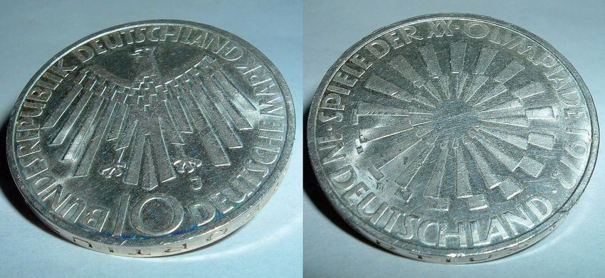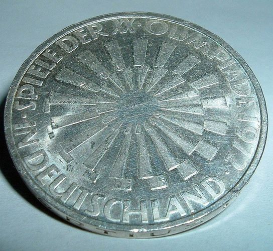 10 DM J Silber Münze Olympiade 1972 mit einer einzigartigen Geschichte. Spiele der XX. Olympiade 1972. in Deutschland. Eine politisch bedingte Fehlausgabe der 10-DM-Gedenkmünzen. Die ursprüngliche Umschrift Spiele der XX. Olympiade 1972 in Deutschland war unüblich, da Olympische Spiele traditionell