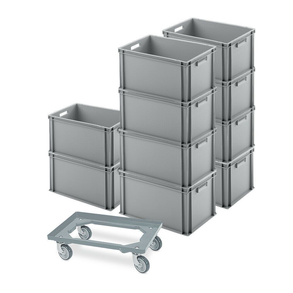 10 Eurobehälter 600x400x320 mm, grau + GRATIS Schwerlast-Transportroller