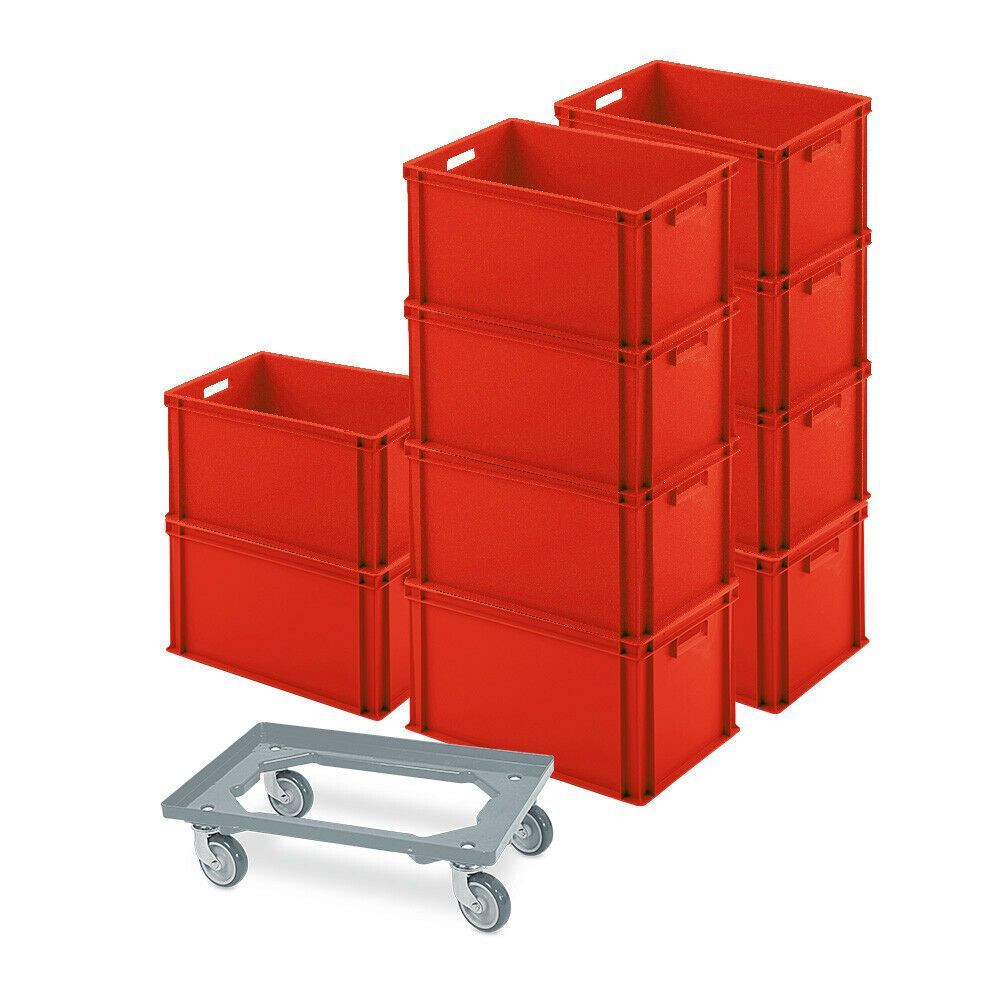 10 Eurobehälter 600x400x320 mm, rot + GRATIS Schwerlast-Transportroller