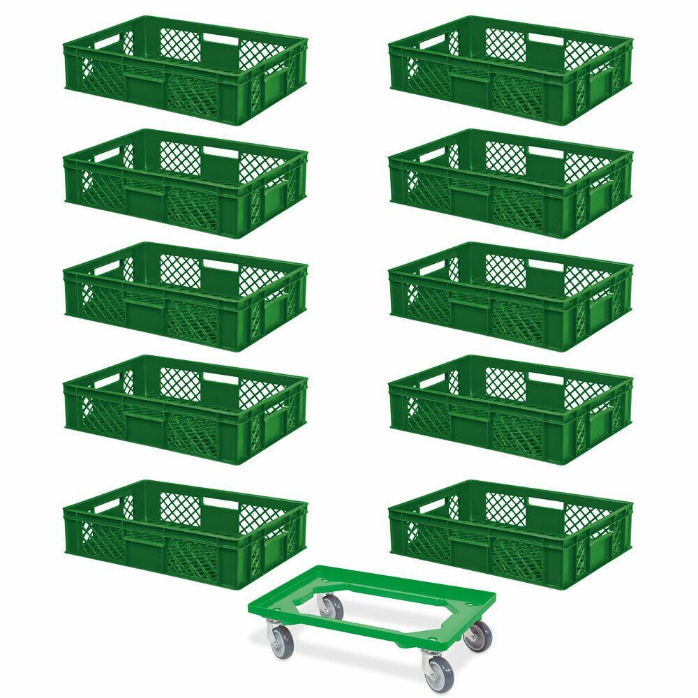 10 Euroboxen, 600x400x150 mm, lebensmittelecht, grün + Transportroller
