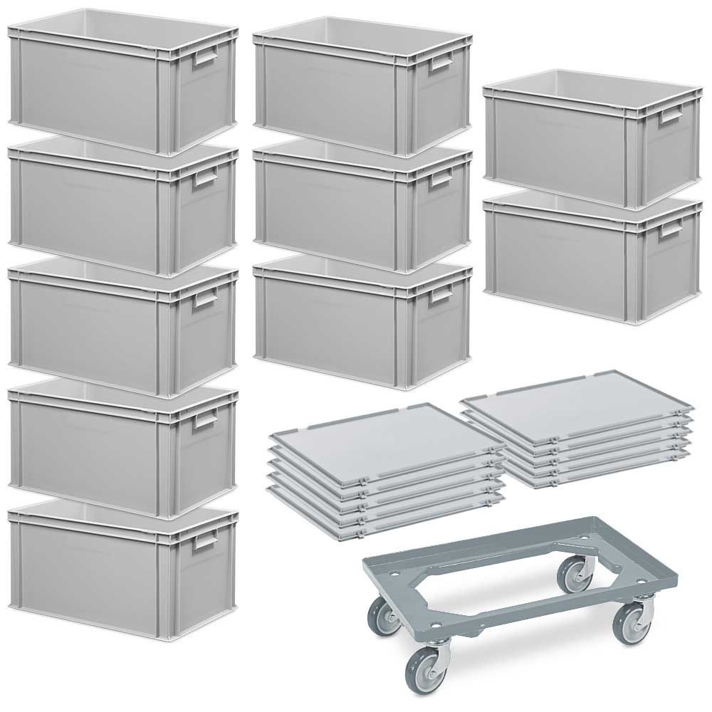 10 Euroboxen, LxBxH 600x400x320 mm + 10 Scharnierdeckel + 1 Transportroller, grau