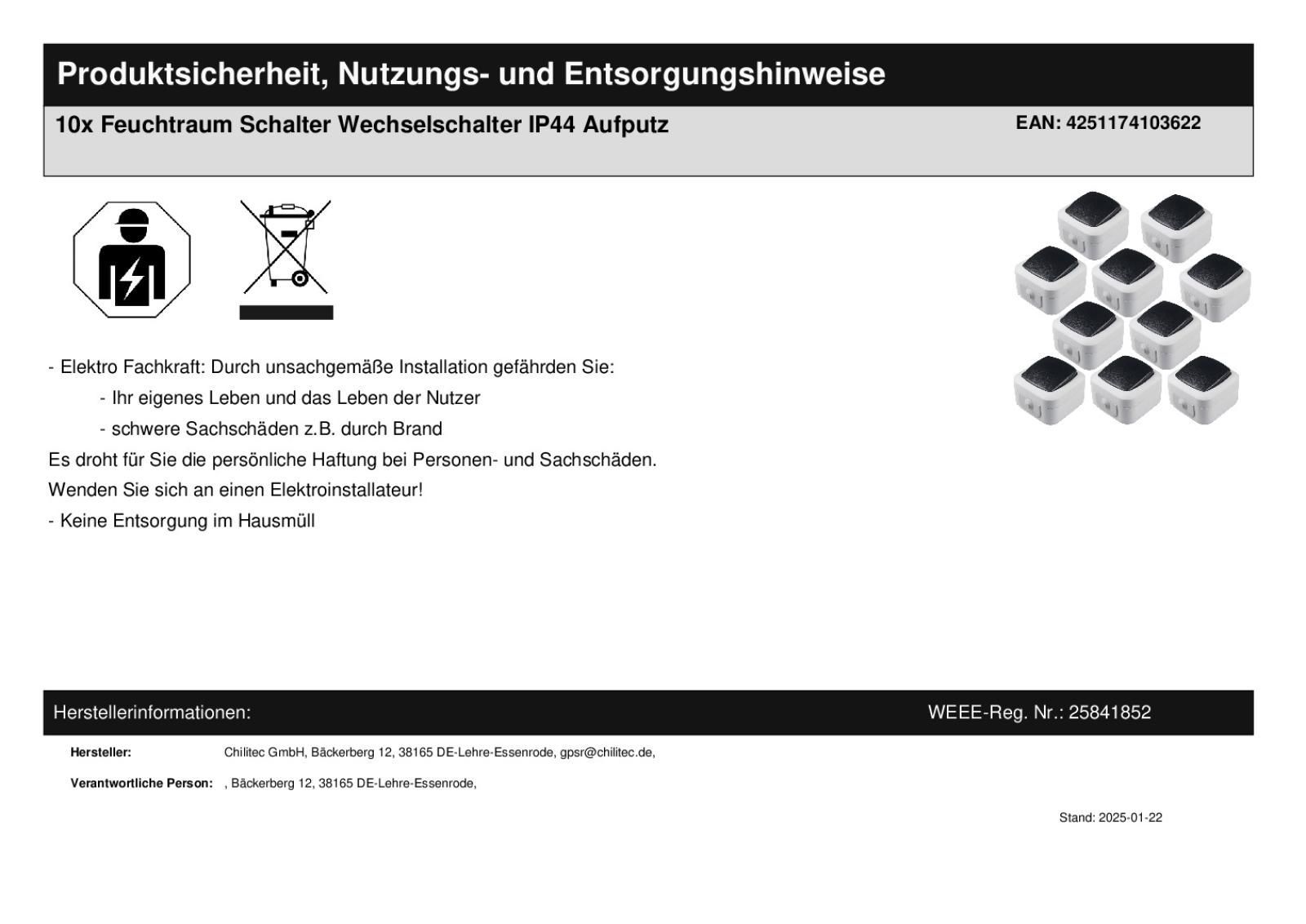 ChiliTec 10 Feuchtraum Wechselschalter Aufputz Wechsel Schalter 10er Set FR AP IP44