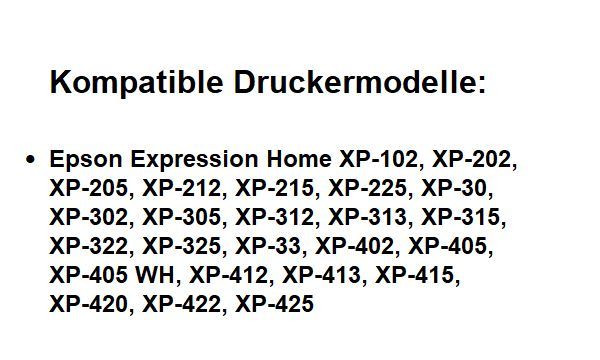 10 kompatible Tintenpatronen Druckerpatronen T1811, T18XL black ersetzen Epson T1801, T1811, T18 XL (Gänseblümchen) Geeignet für folgende Drucker und Multifunktionsgeräte: Epson Expression Home XP-102, XP-202, XP-205, XP-212, XP-215, XP-225, XP-30, XP-302, XP-305, XP-312, XP-313, XP-315, XP-322, XP-... Mehr