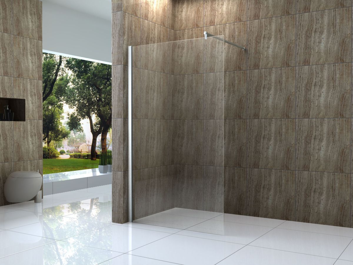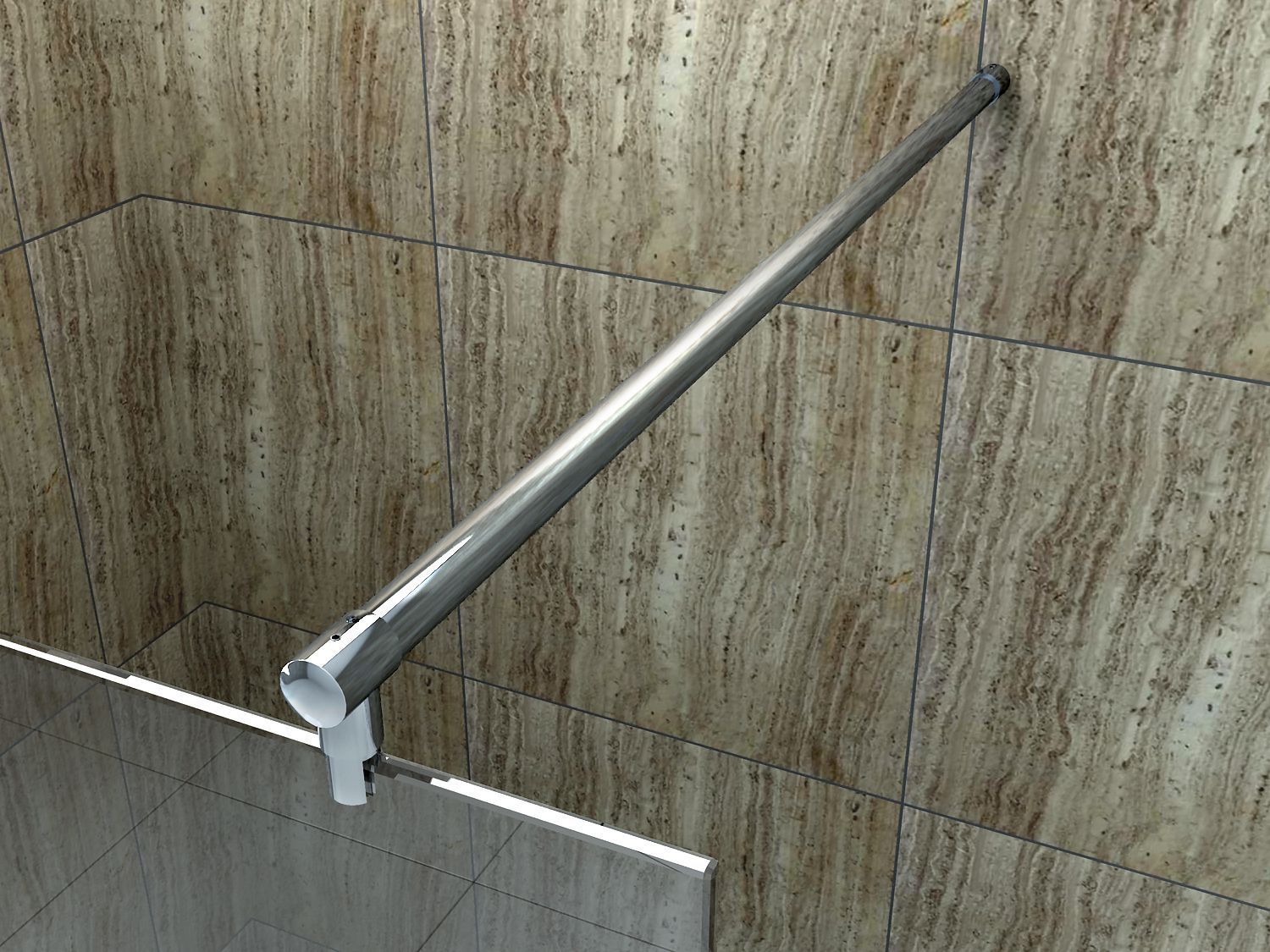 Glasscheibe aus 10 mm dickem Sicherheitsglas (ESG) Glas-Beschichtung zur leichten Reinigung hochwertige Aluminiumprofile (verchromt) vollständige Verdeckung der Verschraubung Stabilisationsstange in 100 cm im Lieferumfang enthalten (kürzbar), auf Wunsch auch in 140 cm lieferbar (49,- € Aufpreis