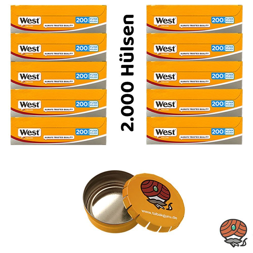 2.000 West Yellow King Size Filterhülsen + 1 Taschenaschenbecher (nicht wählbar) Hülsen: Die Filterhülsen eignen sich zum Stopfen von allen handelsüblichen Volumen- Stopftabaken. Zum Stopfen dieser Filterhülsen benötigen Sie einen Stopfer für Standardhülsen oder ein variables Stopfgerät für Standard