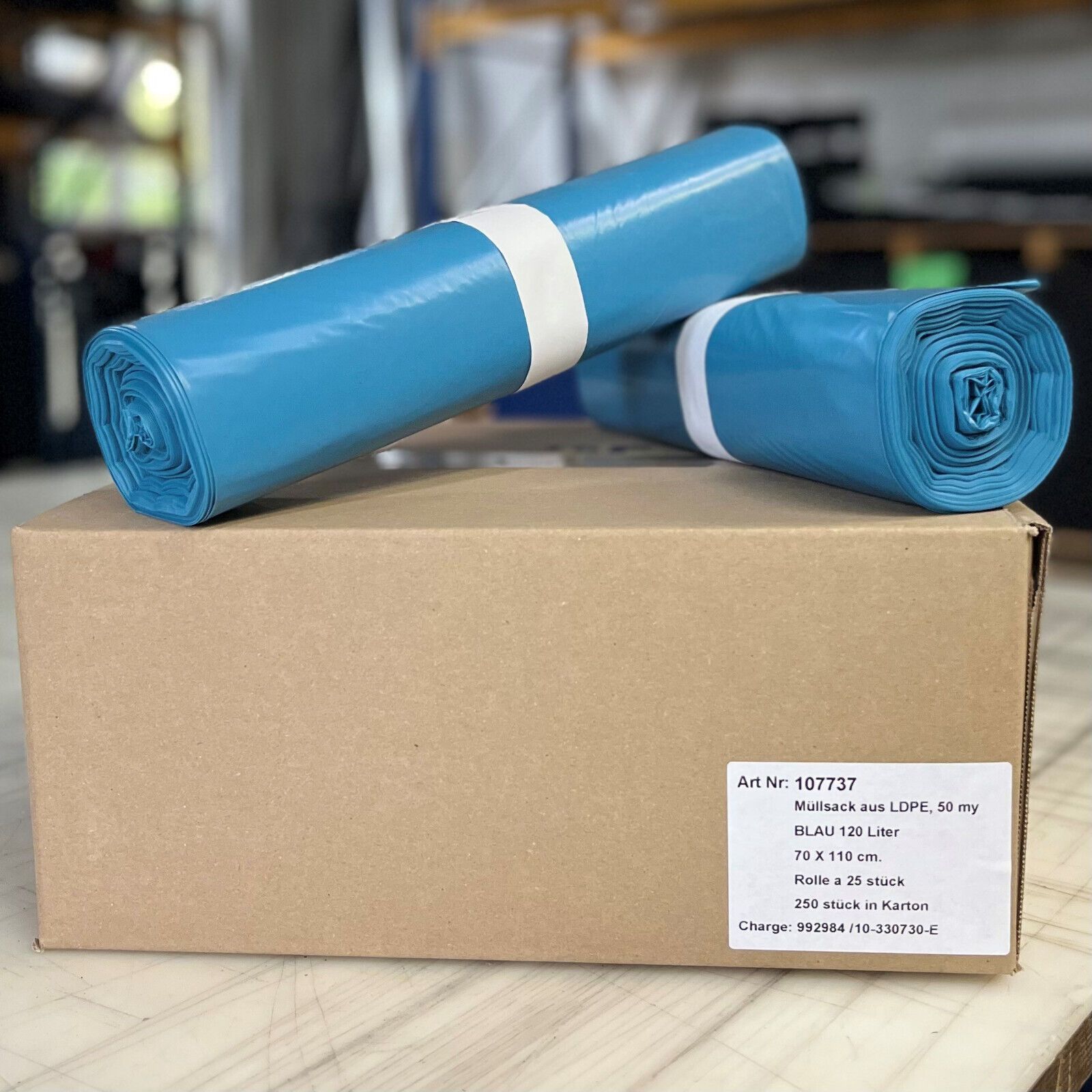 Müllsäcke aus HDPE 120Liter Blau ca. 50 my Rolle á 25 Stk im Karton ( ges. 250 Beutel) aus Polyethylen Perforiert zum Abereißen 700mm x 1100mm x 0,05mm Lieferung im Karton