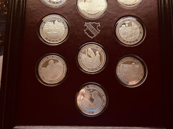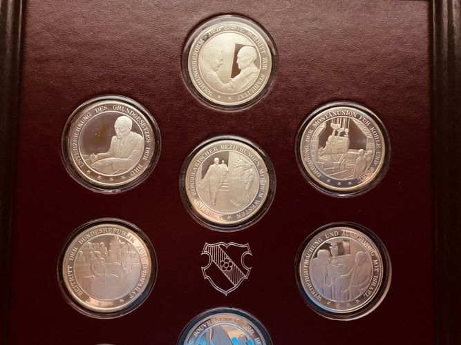 10 Silbermedaillen Die Ära Adenauer 24 karätiges Gold auf Sterlingsilber (925 1000) Prägejahr 1975 Proofqualität (PP) ø = 44 mm Holzgerahmte Medaillentafel in einer Präsentationskassette Ab März 1975 wurde jedem Vorausbesteller für die Dauer von zehn Monaten monatlich jeweils eine Münze zuges