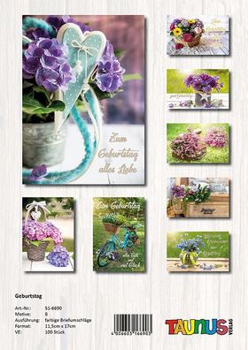 Geburtstagskarten Blumen - 100 Stück - 8 Motive